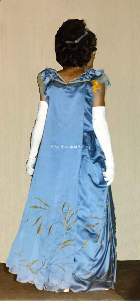 This is one of the smallest gowns in the collection and was made in Paris of sky-blue silk taffeta. It has Empire lines and a Watteau back. There are two skirts, the outer one shirred and puffed so that the heavy embroidered underskirt will show.