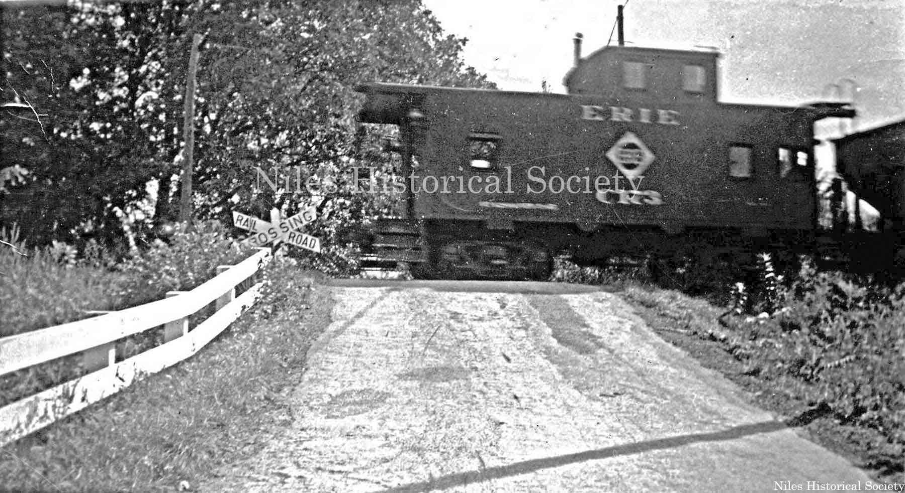 Erie Rail Road caboose as it crosses over County Line Road in Mineral Ridge.