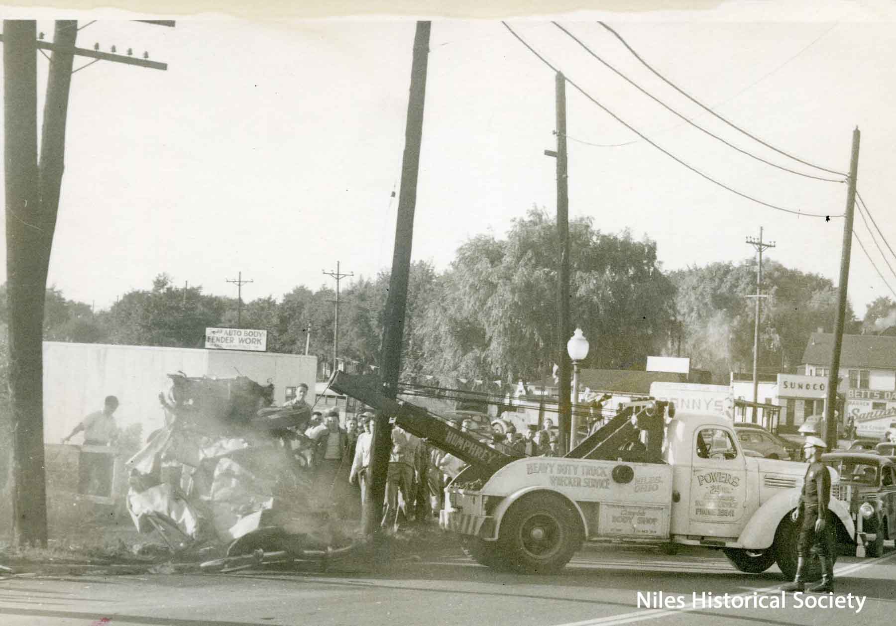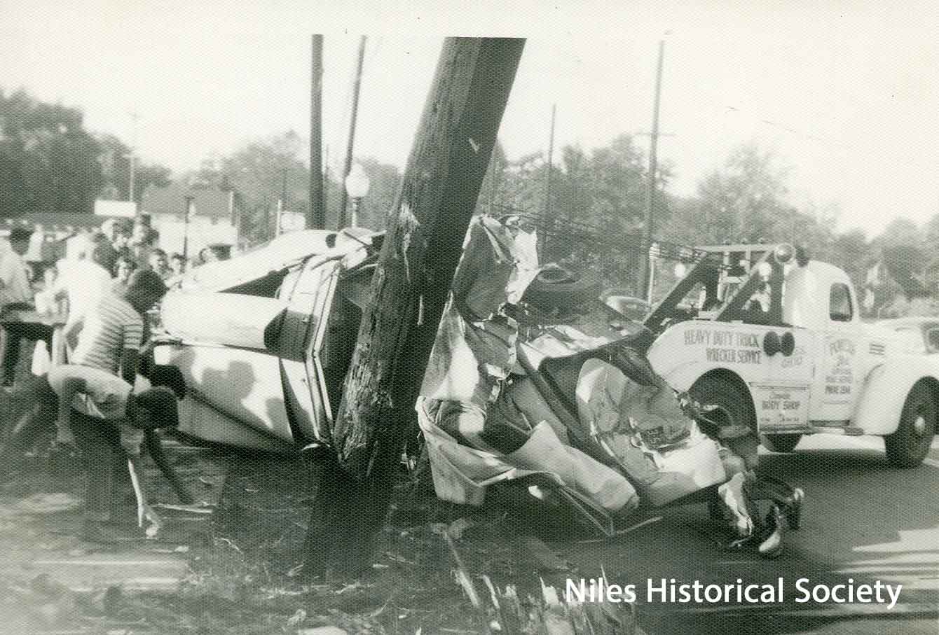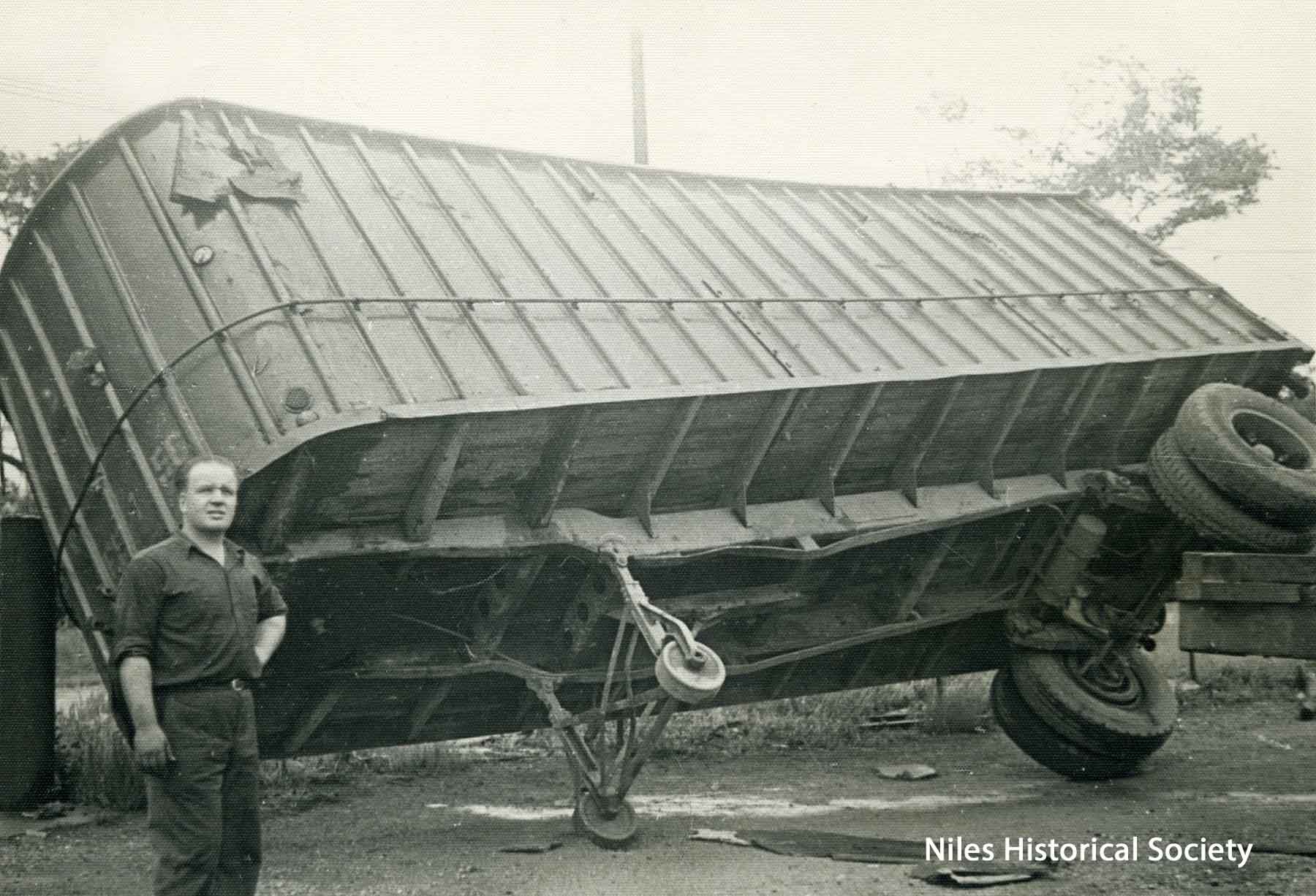 Pictured is an overturned truck at Elmer Brewer Trucking Co. Building visible in background.