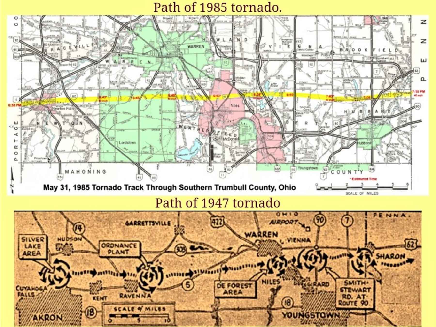 June 7th 1947 an F4 tracked through Trumbull County Ohio, then in 1985 the Niles/ Wheatland F5 tornado took almost the exact same path 38 years later, with one week off of the exact same month and day.