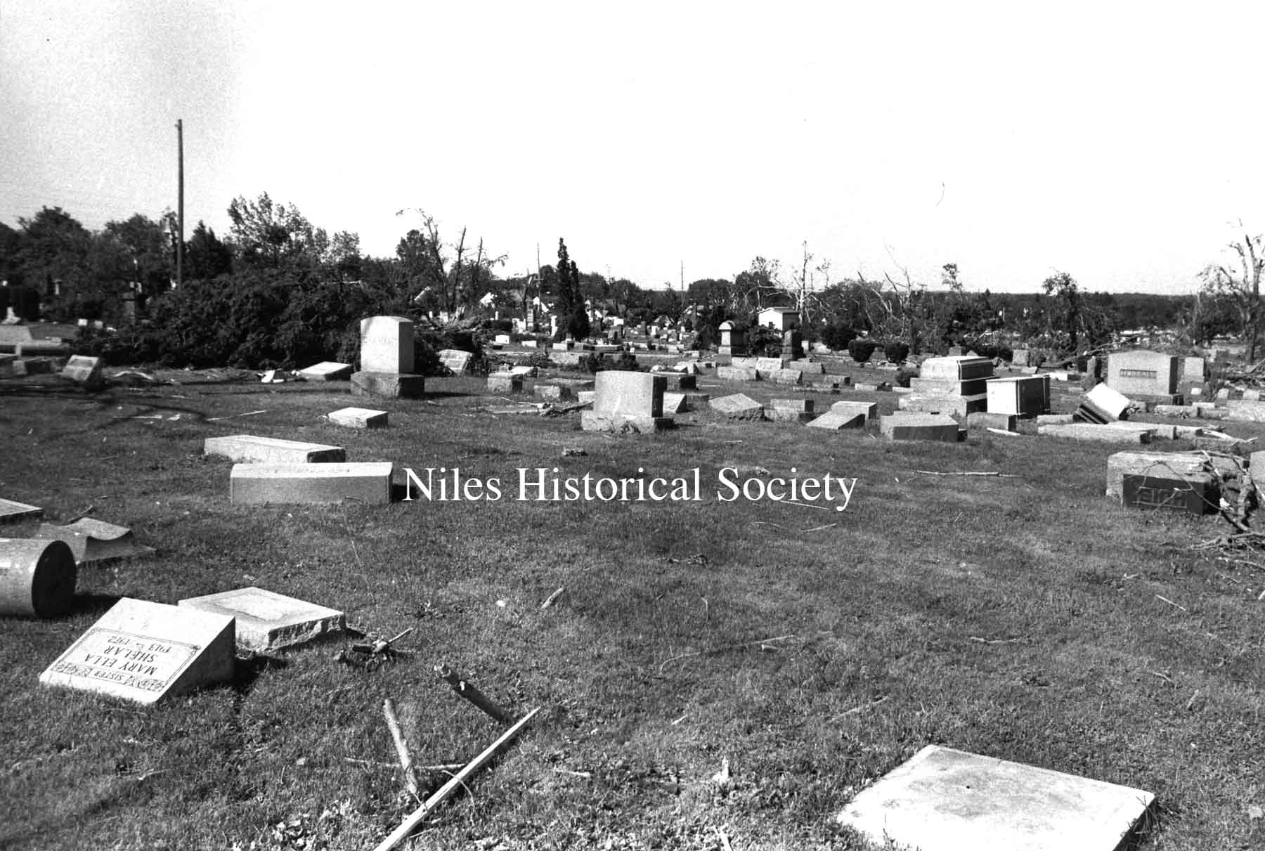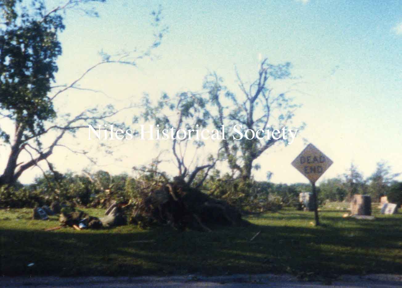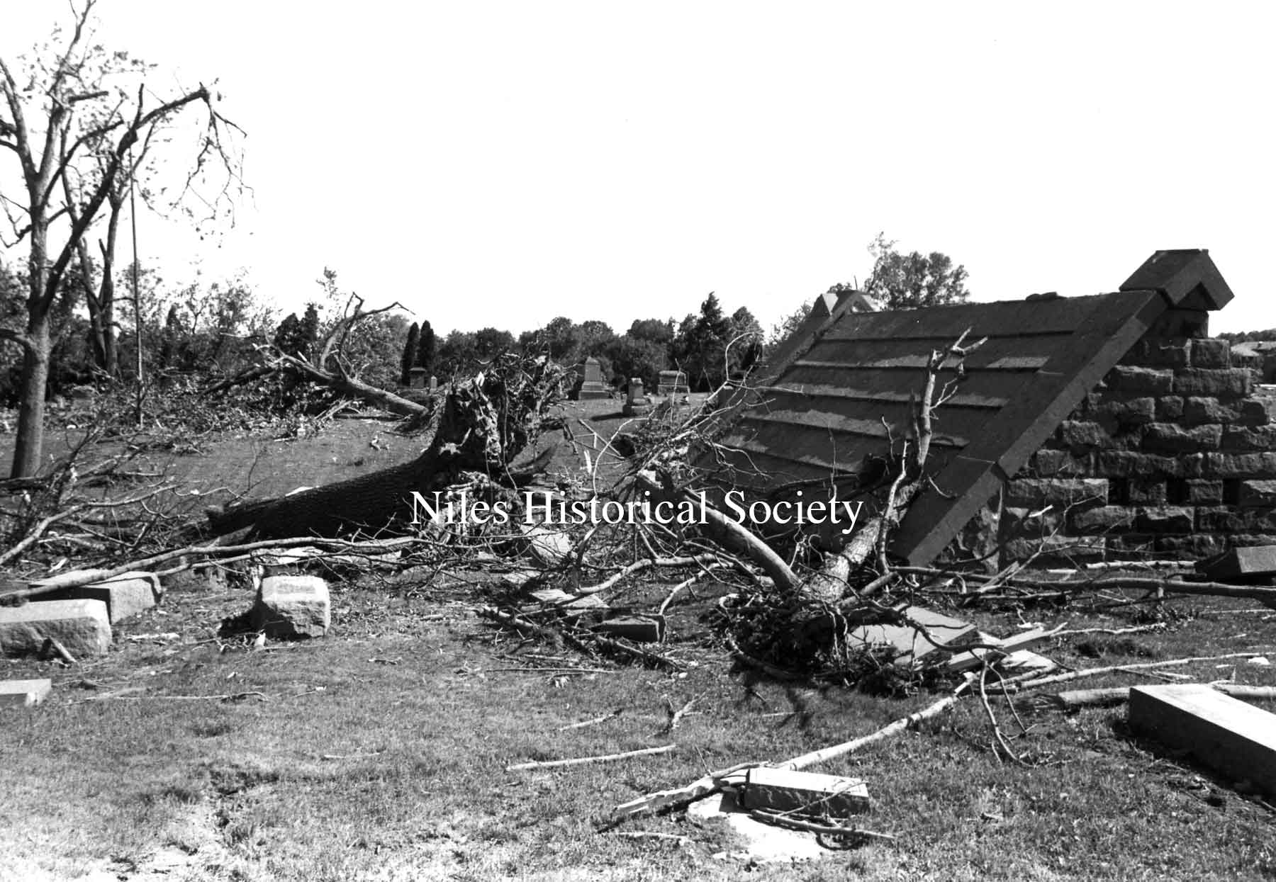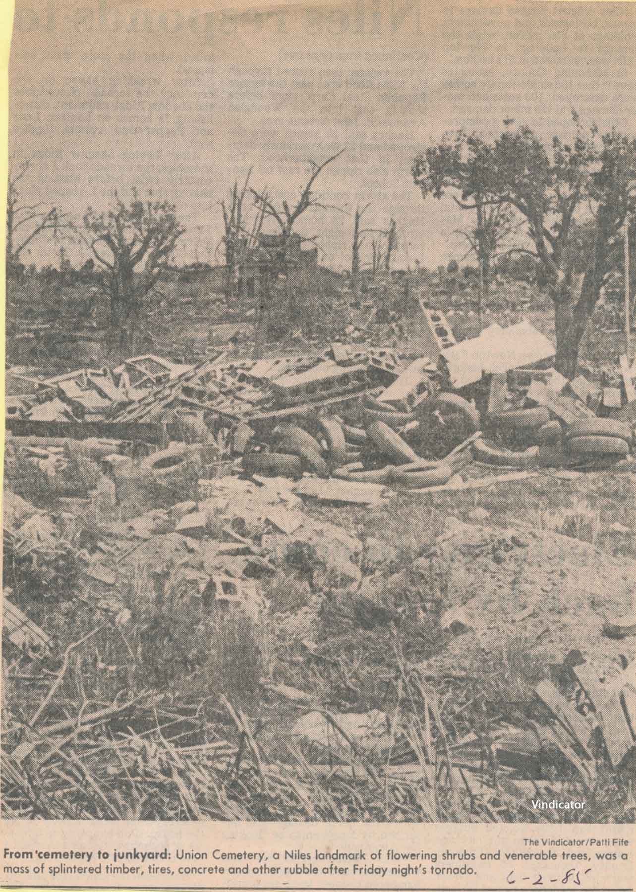 from cemetery yo junkyard. Union Cemetery, a Niles landmark, of flowering shrubs and venerable trees, was a mass of splintered timber, tires, concrete and other rubble after Friday night's tornado.