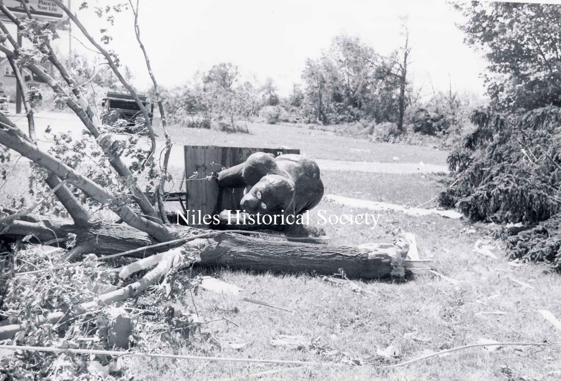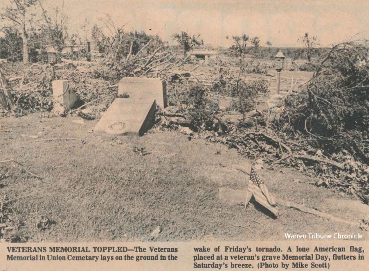 The Veteran's Memorial in Union Cemetery lays on the ground in the wake of the May 31, 1985 tornado.