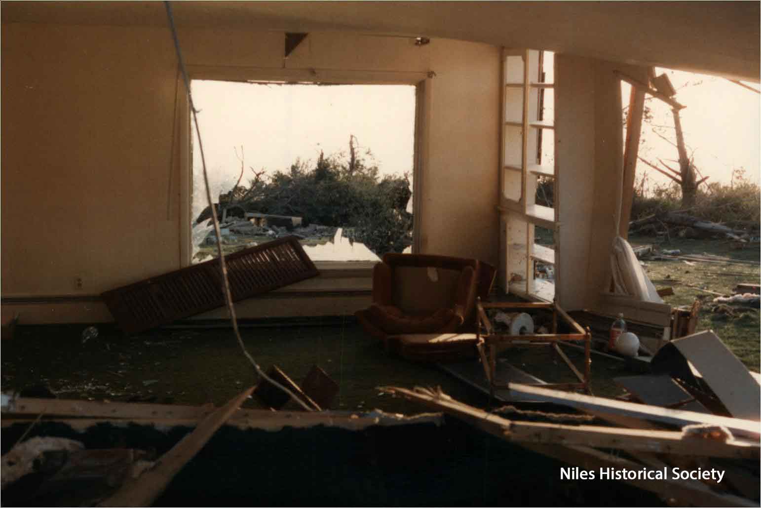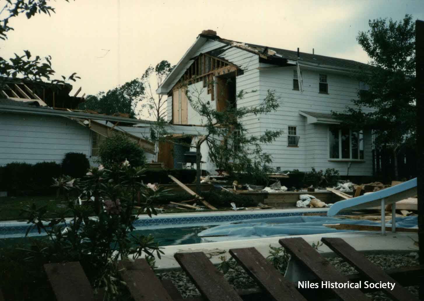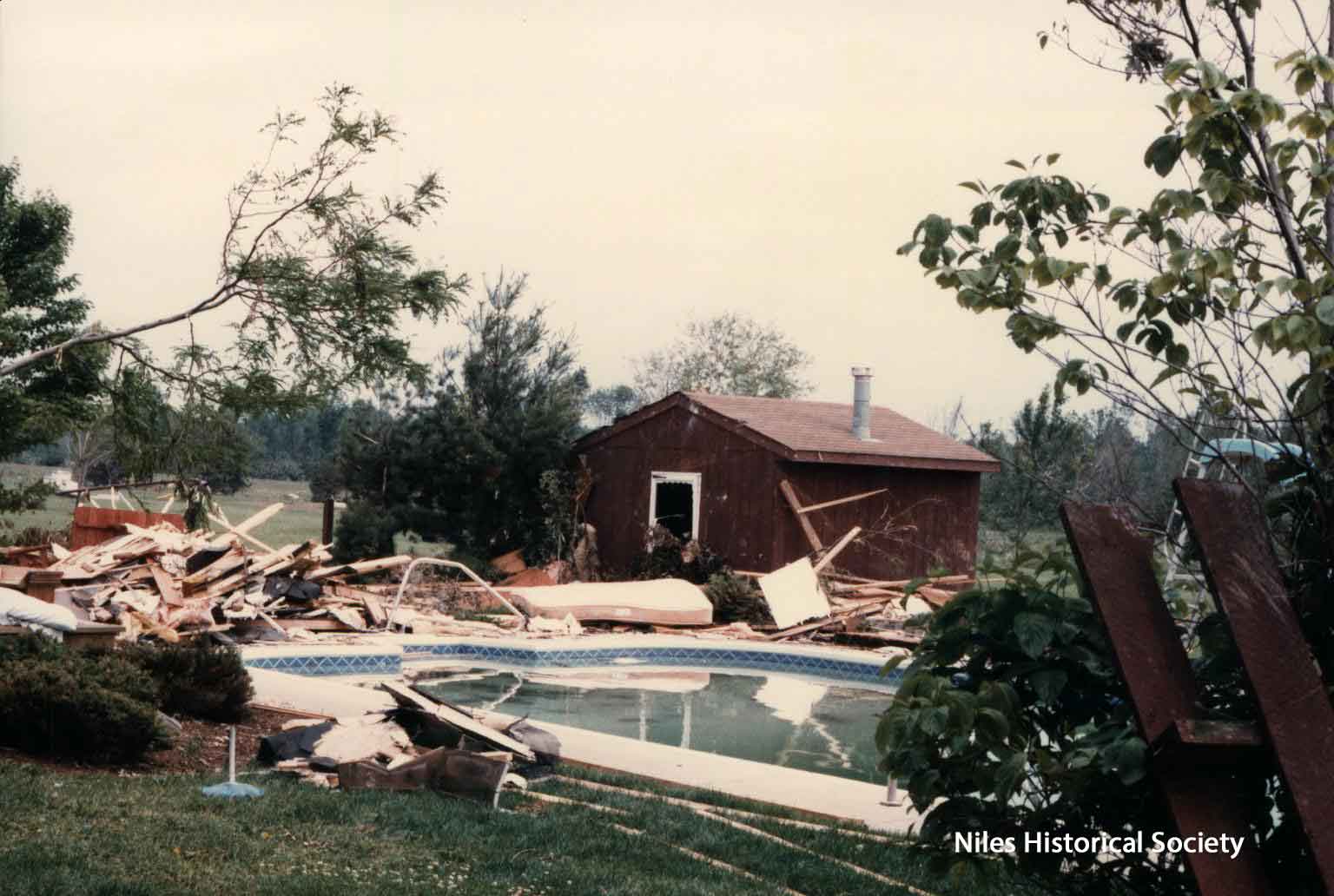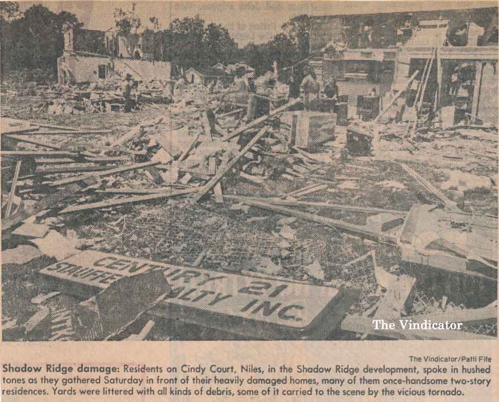 The Niles Ohio map shows a straight red line indicating the path of the 1985 Tornado.