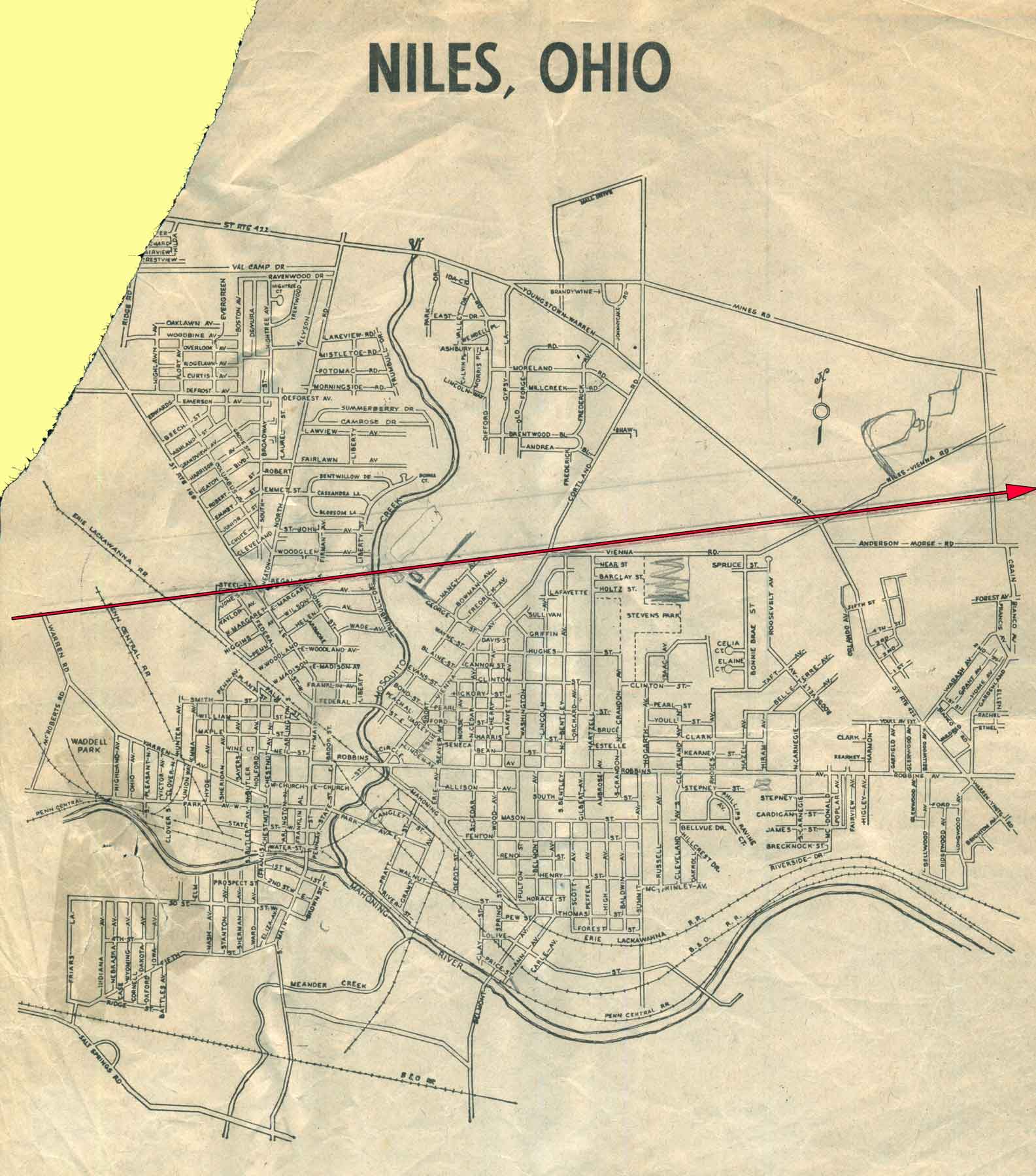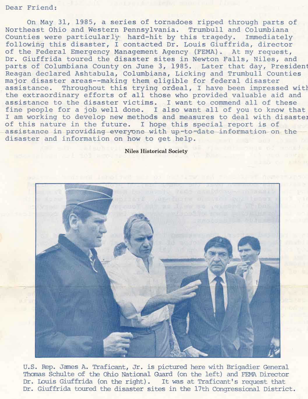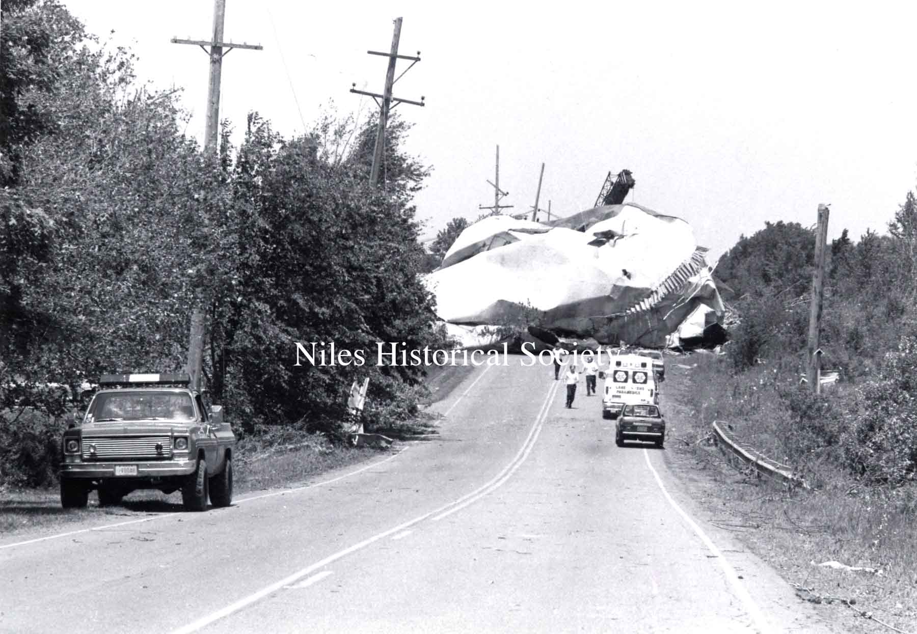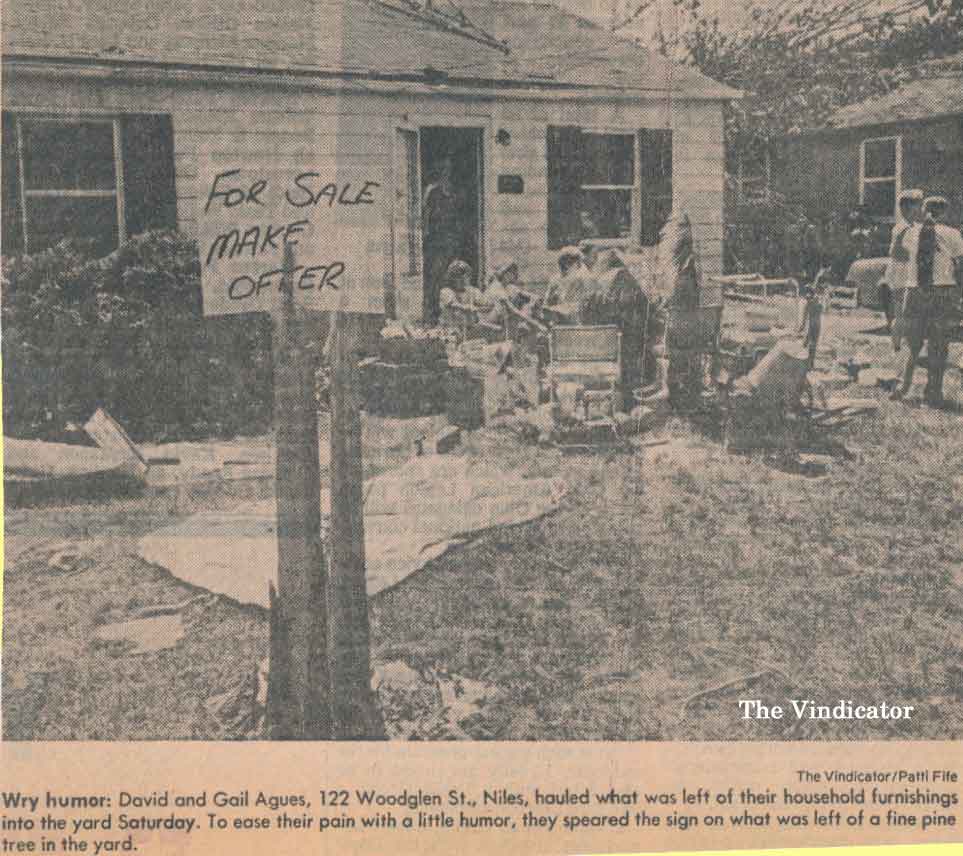 The Niles Ohio map shows a straight red line indicating the path of the 1985 Tornado.
