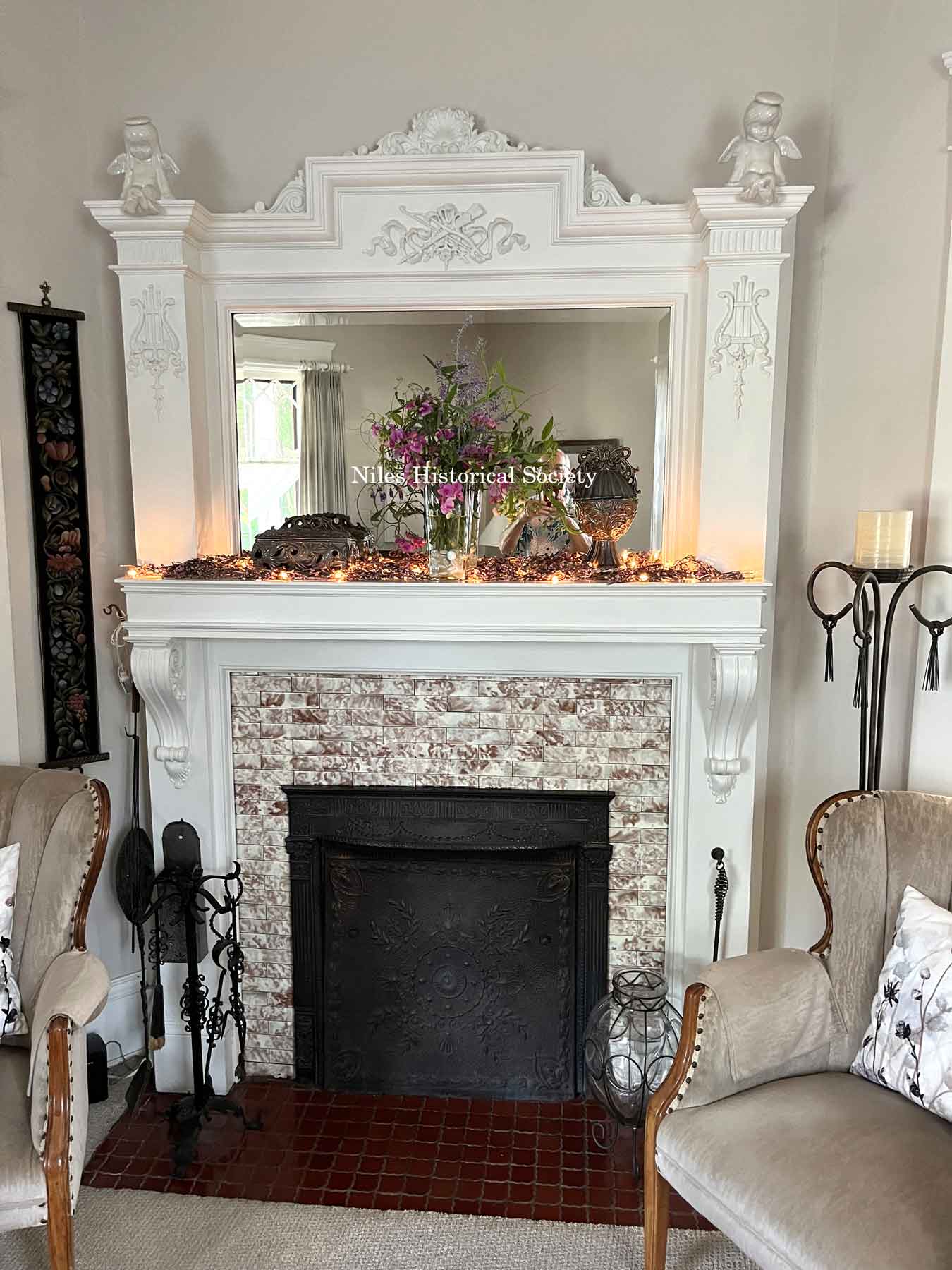 Fireplace in left living room area.