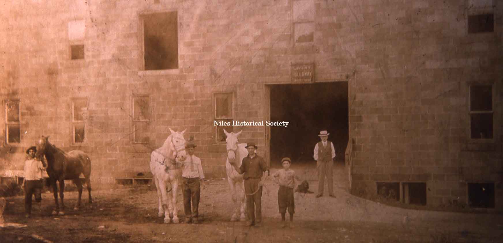Holloway's Livery and Undertaking was located on East Park Avenue. James C. Holloway(hands on hips) and Ray Holloway-by door, ca 1893.