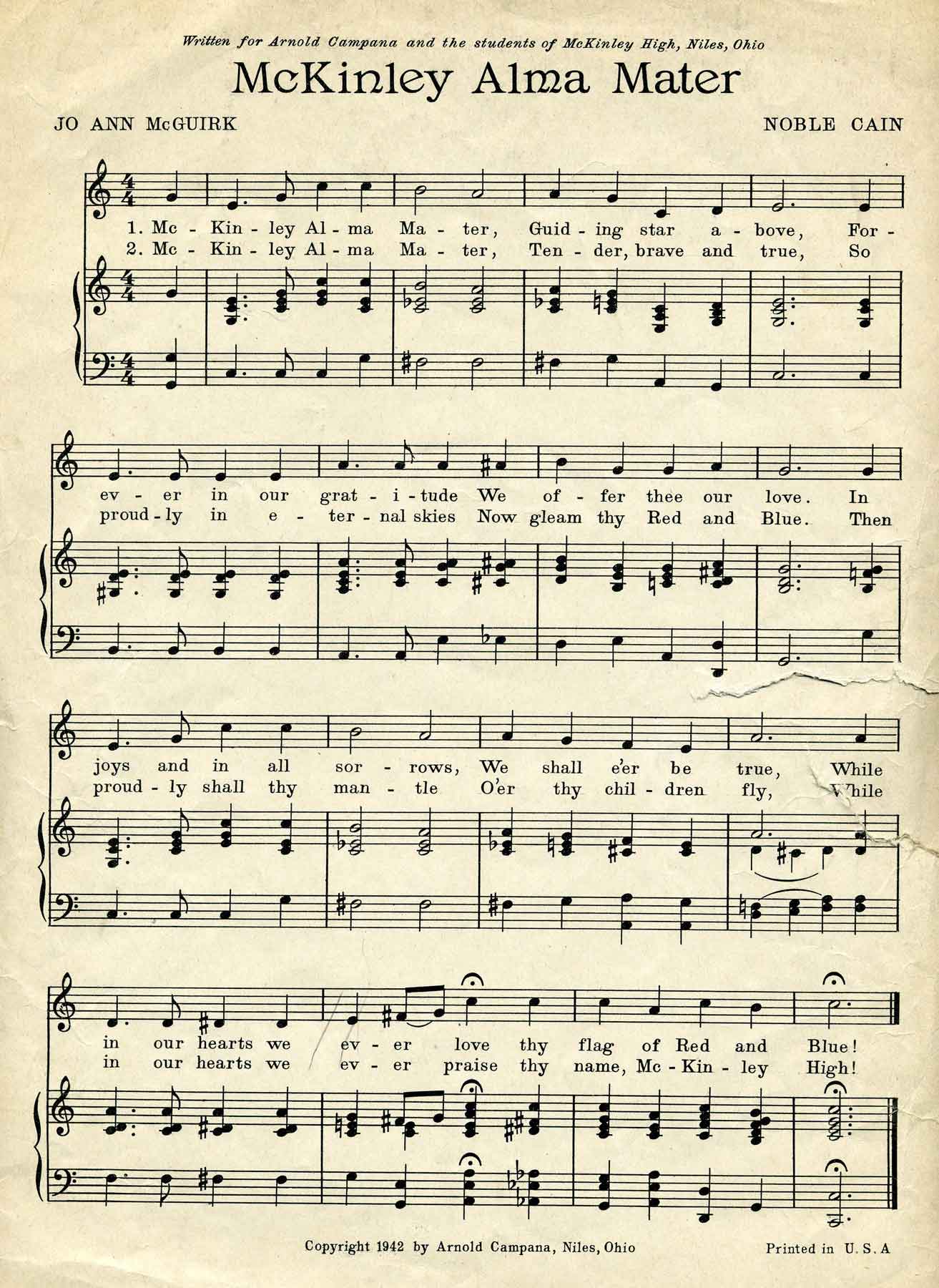 | Niles McKinley Alma Mater. Jo Ann McGuirk wrote songs and poems for her own amusement. During her sophomore year of 1942 at Niles High School, she entered the school contest and her lyrics were chosen for the Niles High school Alma Mater by Noble Cain. Noble Cain was a nationally-known musical arranger who wrote the music to accompany Jo Ann’s lyrics. Jo Ann also had one of her poems published by the Ohio State poetry Committee. She graduated infrom Niles High School 1944 and went on to become a registered nurse. Jo Ann’s mother, Violet Stein McGuirk, and father, Francis McGuirk, raised nine children: Jo Ann, Eileen, Marilyn, Raymond, Maureen, Barbara, Karen, Brian and Michele. The Alma Mater was copywrited in 1942 by Arnold Compana who was the Niles High school band director at that time. The song has two verses and is shown with the front cover below. |