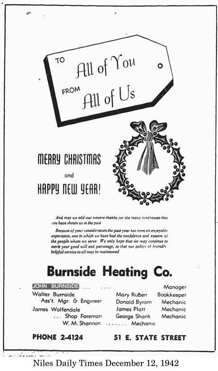 Burnside Started Heating Company Fifteen Years Ago. Niles Daily Times June 17, 1939 Fifteen years ago this month the Burnside Heating Company was started in Niles. It had its beginnings in a little shop on Linden Avenue and remained in that location until three years ago when it moved to its modern rooms at 51 State Street. John Burnside, the owner of the business, has been in the heating business for the past eighteen years. He took his first training from the Skinner Furnace Company in Cleveland, then worked in this business in Warren for three years prior to opening his own shop here in Niles. |