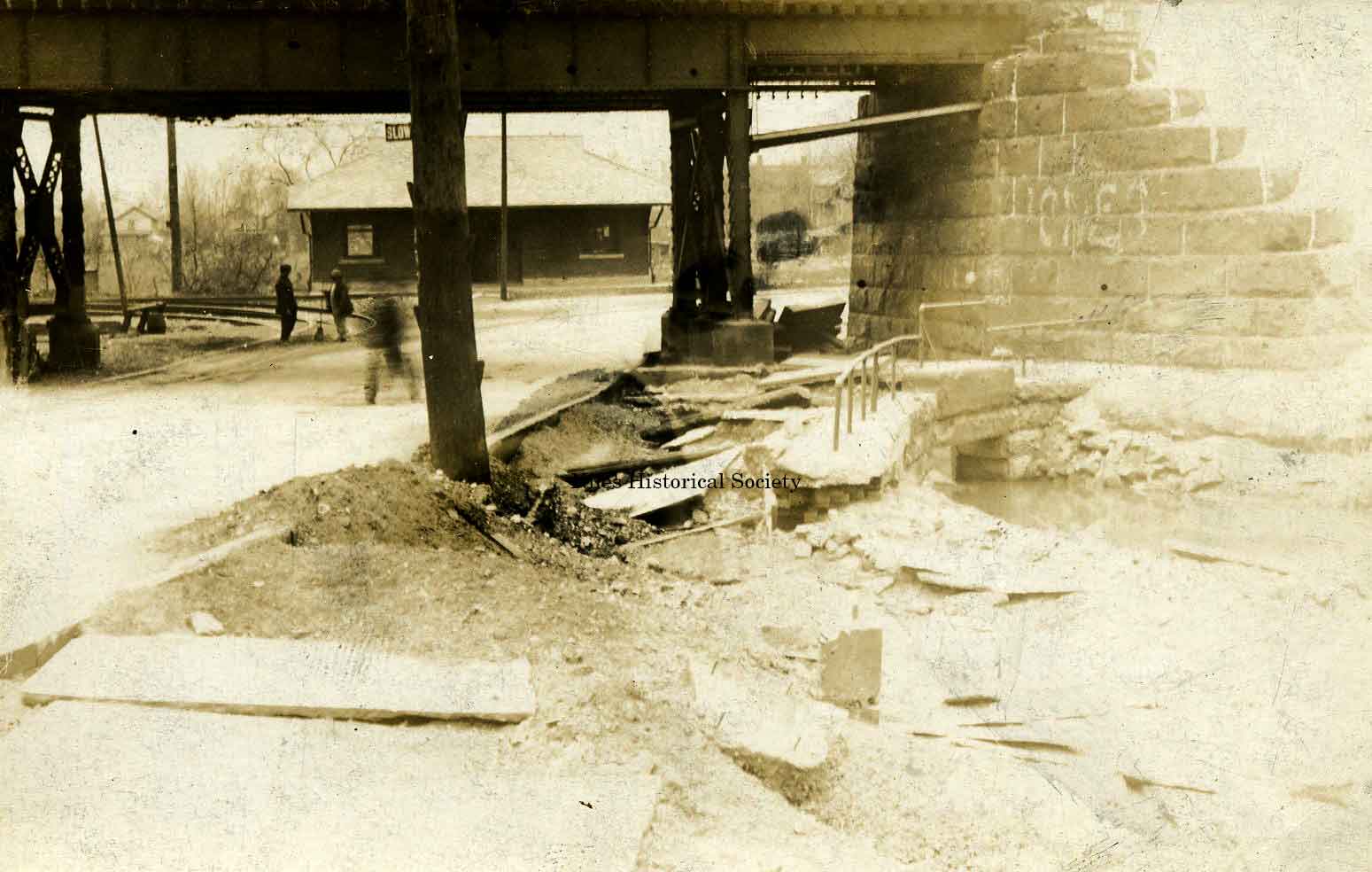 Erie Railroad Bridge. The old Erie Railroad bridge passing over Church Street where it connects to Robbins Avenue. In 1953 a new overpass was built that allowed Robbins Avenue to connect with North Main Street. In the background of this photograph, ca 1913, is the electric railway waiting station. |