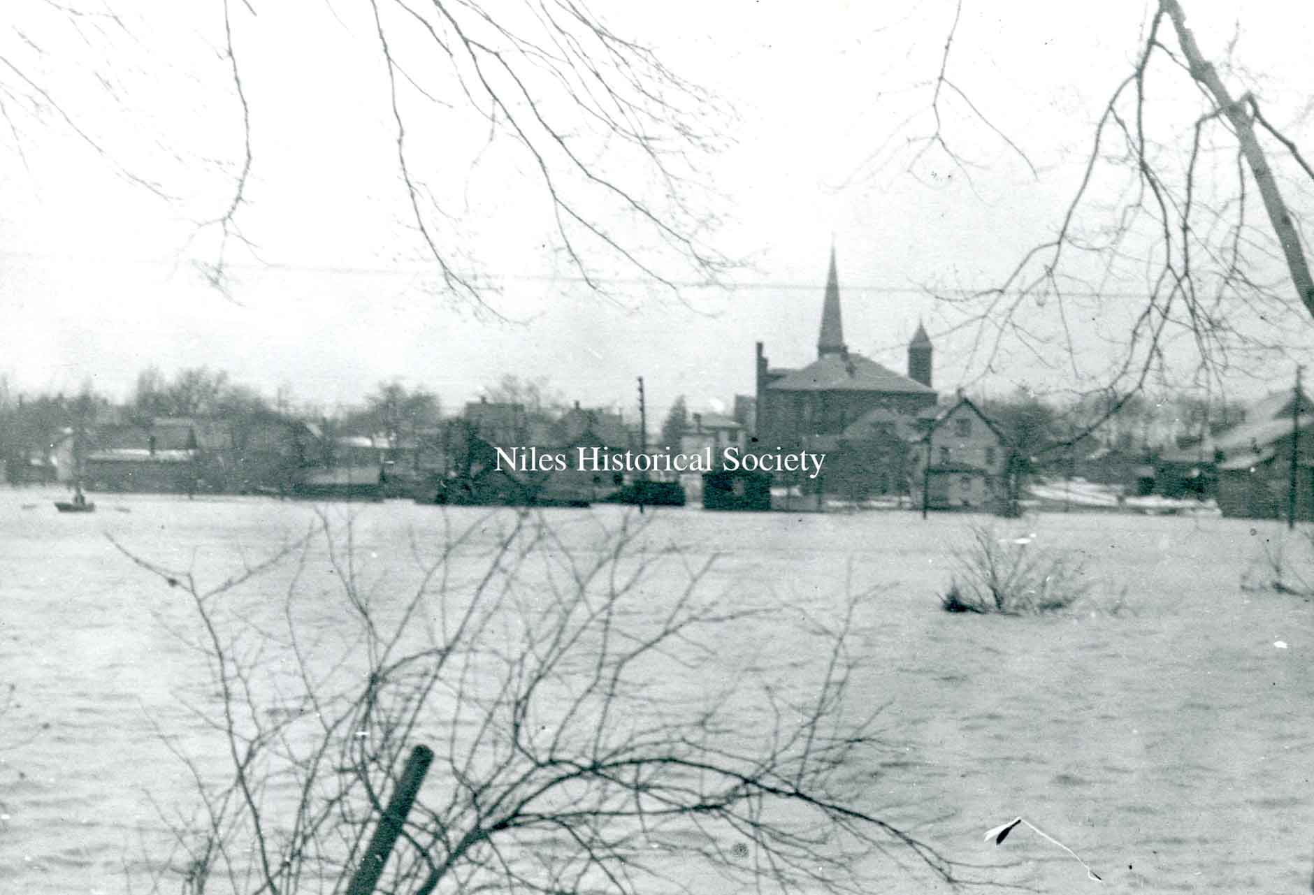 The Mahoning River in full spate from the south side of Niles looking north toward St. Stephen's Church and school.
