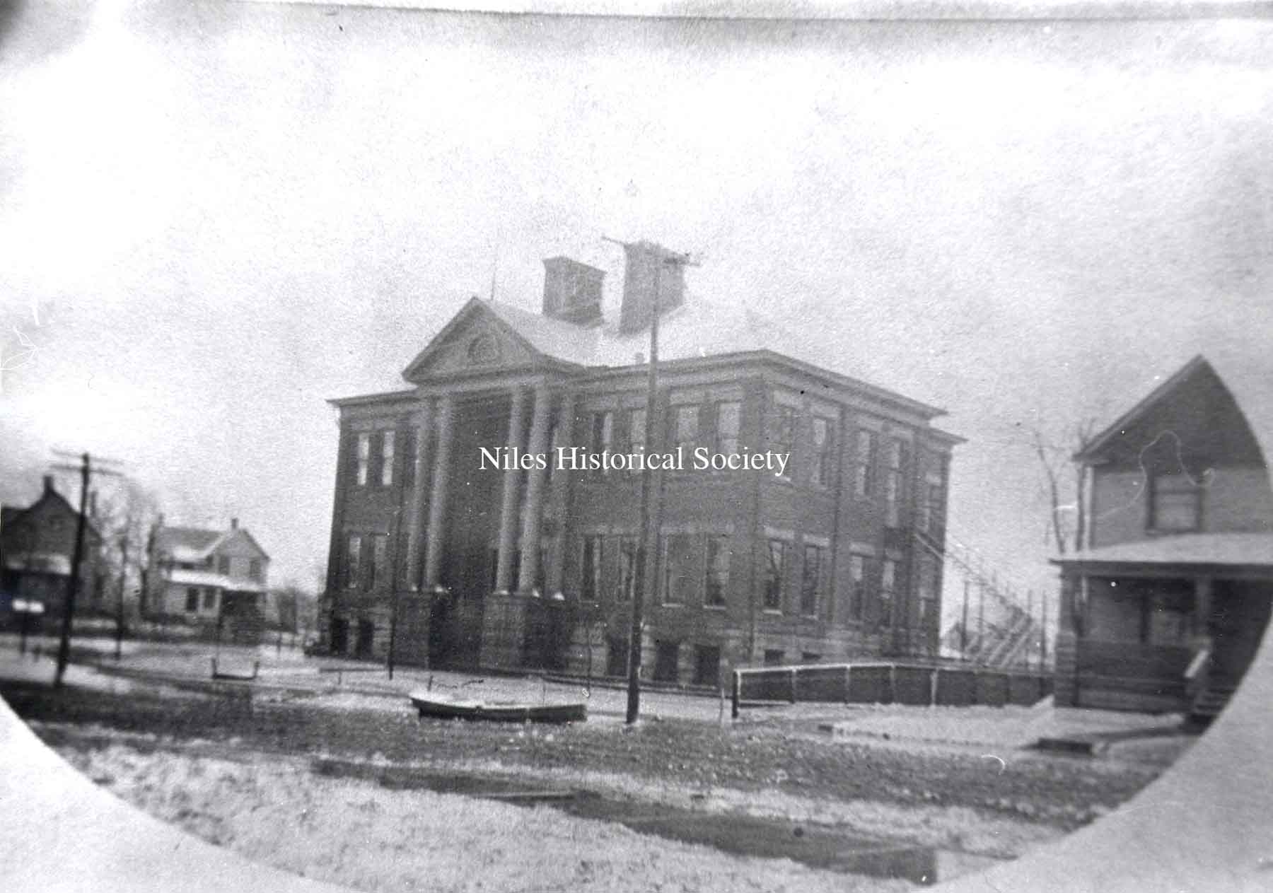 Third Street School, now Garfield School, with a rowboat floating in the street.