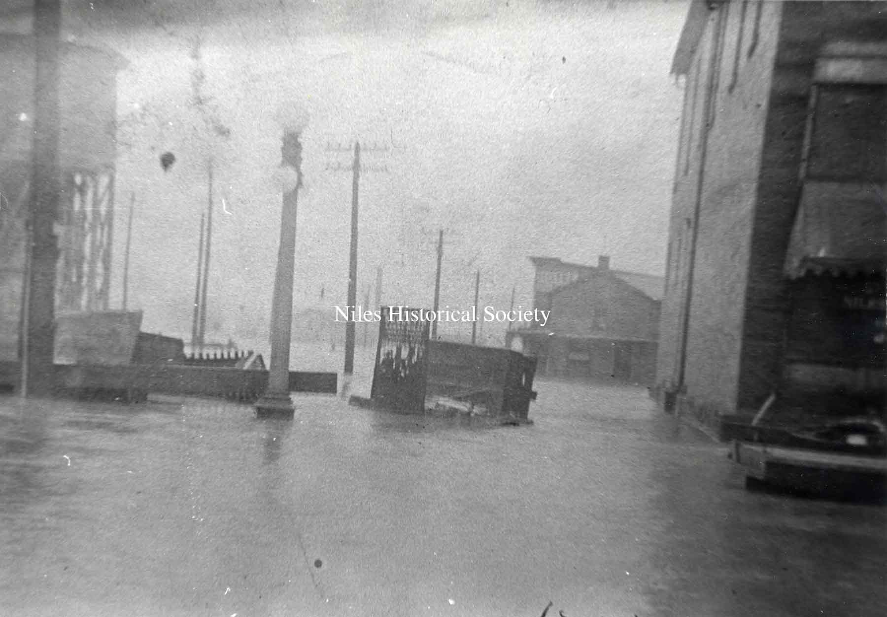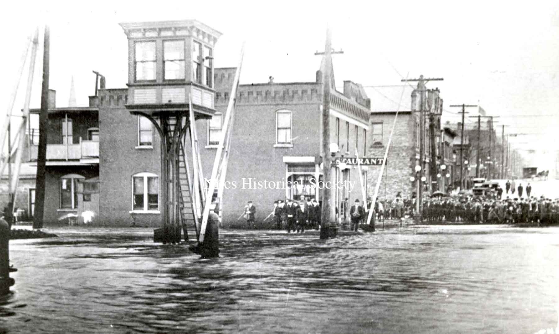 Looking North, the Gilmore Restaurant and Manhattan Hotel on South Main Sreet and Water Street during the 1913 flood.