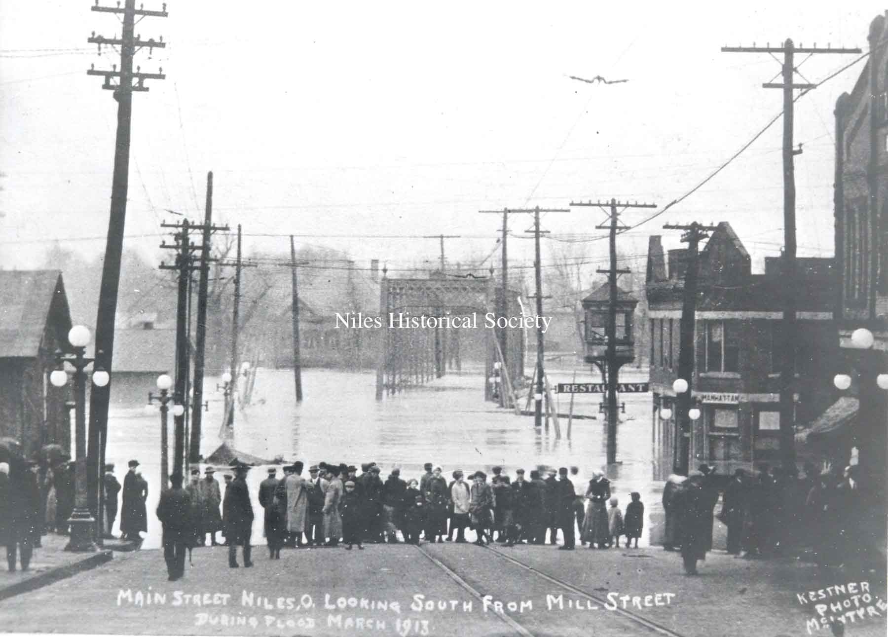 Postcard view of the 1913 flood that created havoc up and down the state. Taken from the Main Street bridge over the Mahoning River facing south. The building at the upper right is the Eagles Lodge building.