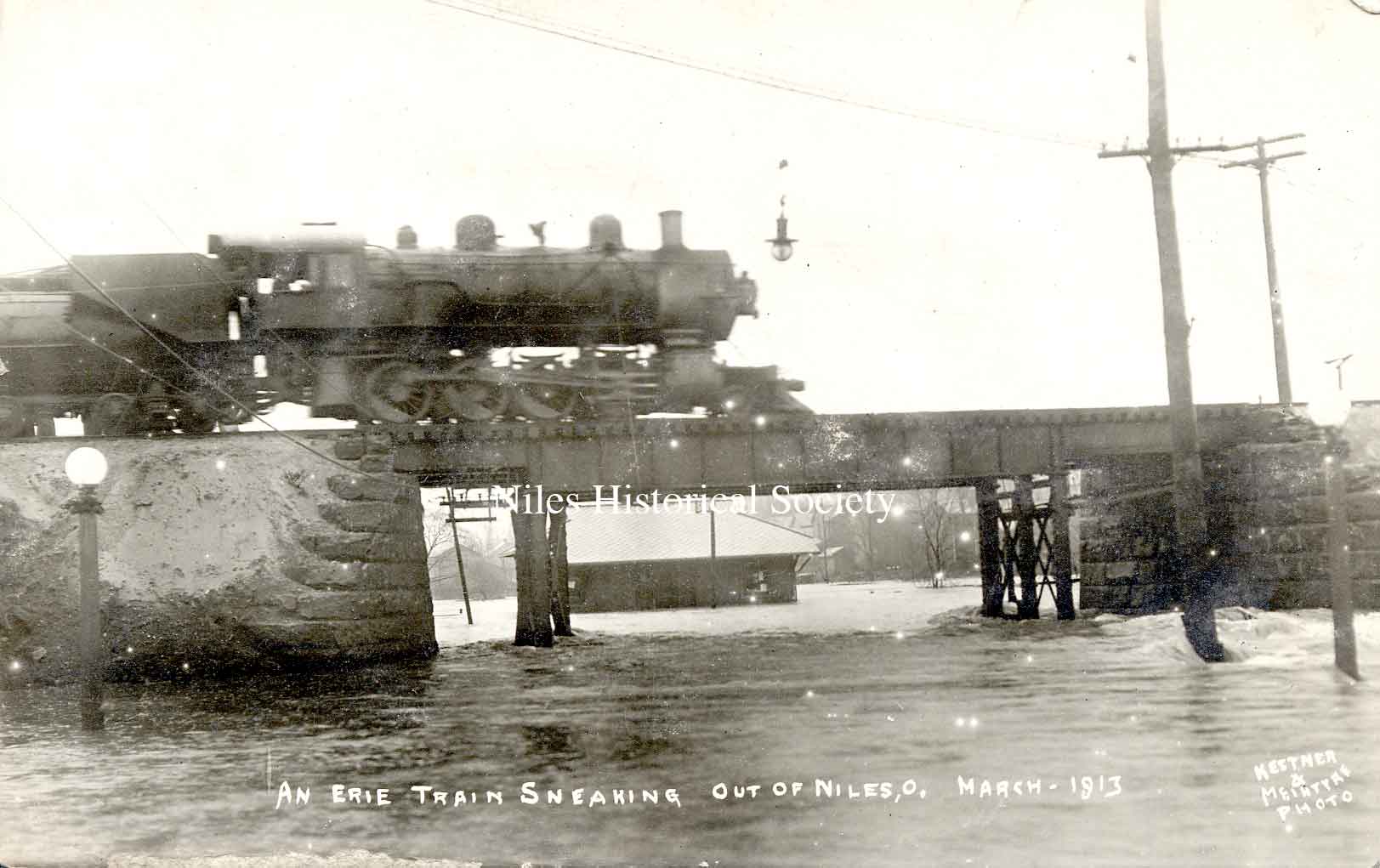 An Erie Train sneaking out of Niles, Ohio across the bridge with Church Street flooded.