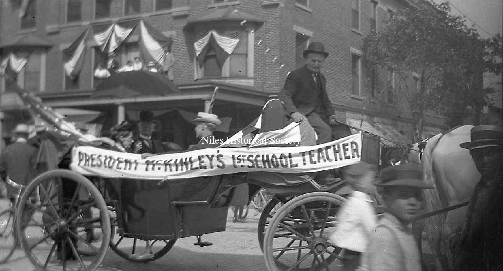 President McKinley's first grade teacher in a carriage in front of the Allison Hotel at the intersection of North Main Street and Park Avenue.
