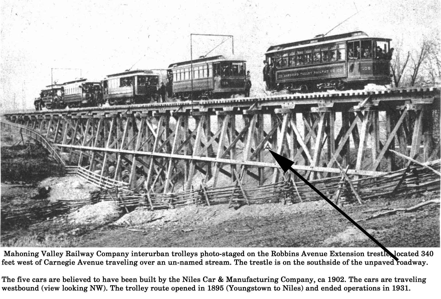 Photo of five Mahoning Valley interurban trolleys on the Robbins Avenue trestle.