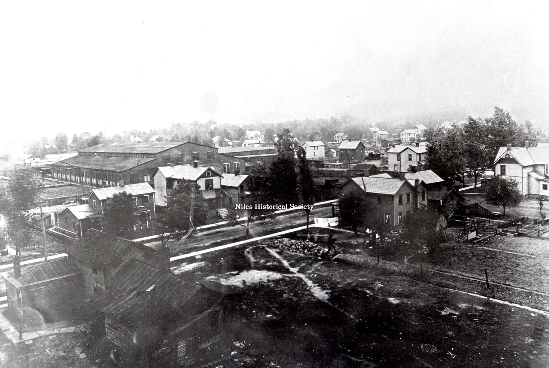 Photo of one building of the Niles Car & Manufacturing Company taken from atop the water tower in the early 1900's. Mason Street is in the foreground