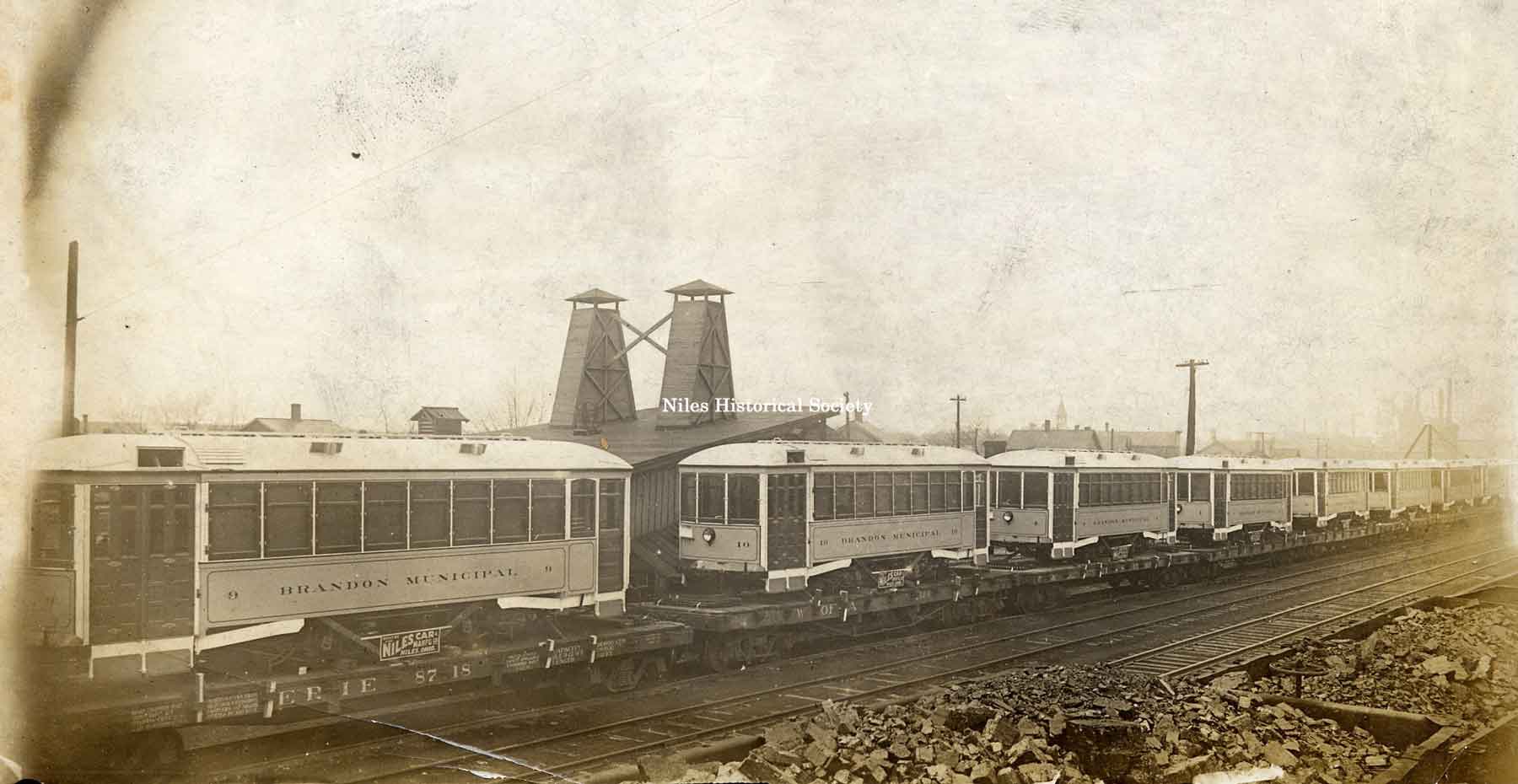 Photo of the interurban cars that were manufactured at the Niles Car & Manufacturing Company on Erie Street and sold to the Boone and Des Moines, Iowa electric railway.