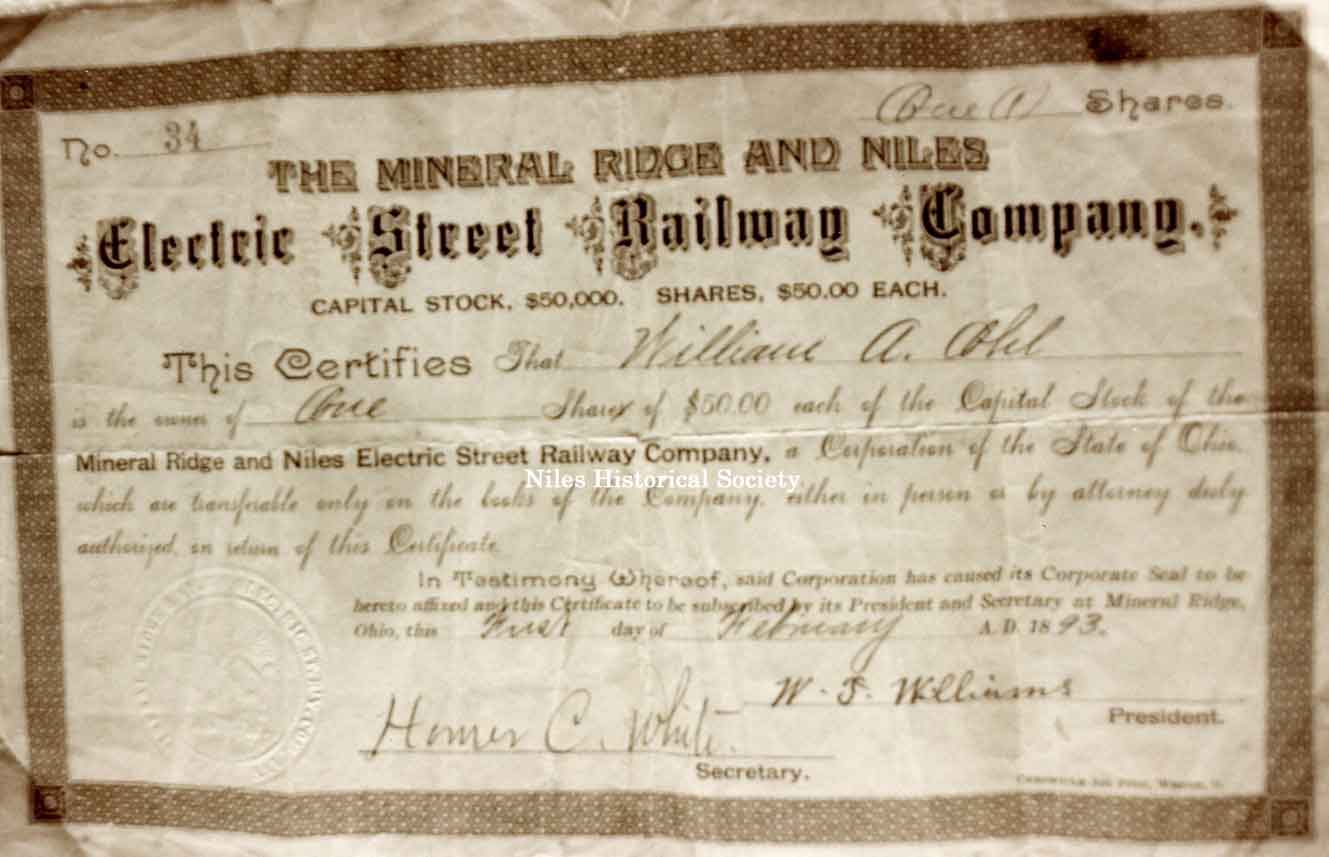 Electric Steel Railway Company Mineral Ridge and Niles stock certificate purchased by William A. Ohl of Mineral Ridge.