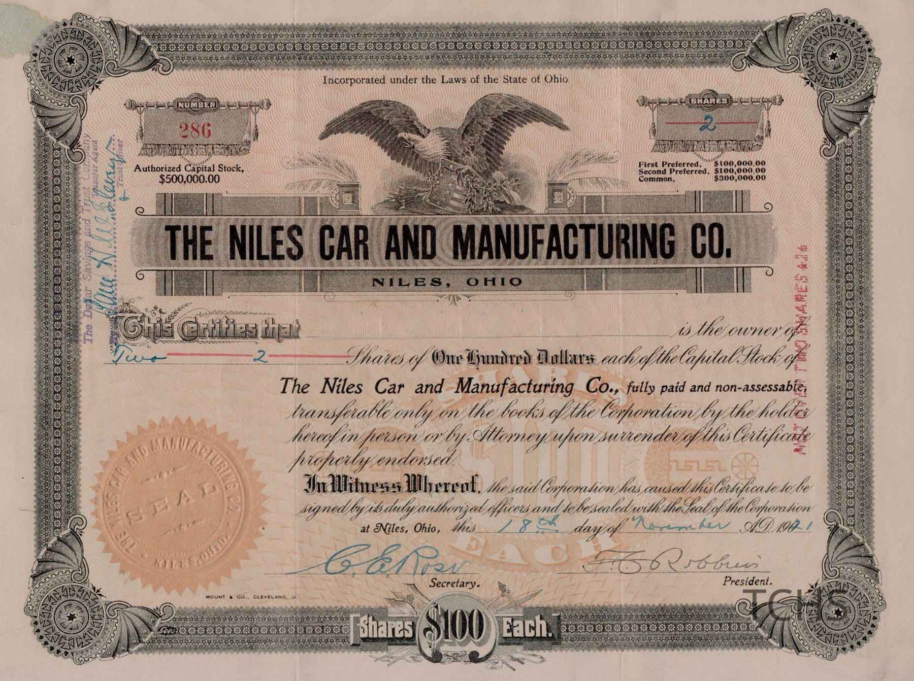 Niles Car and Manufacturing Company stock certificate valued at $100/certificate.