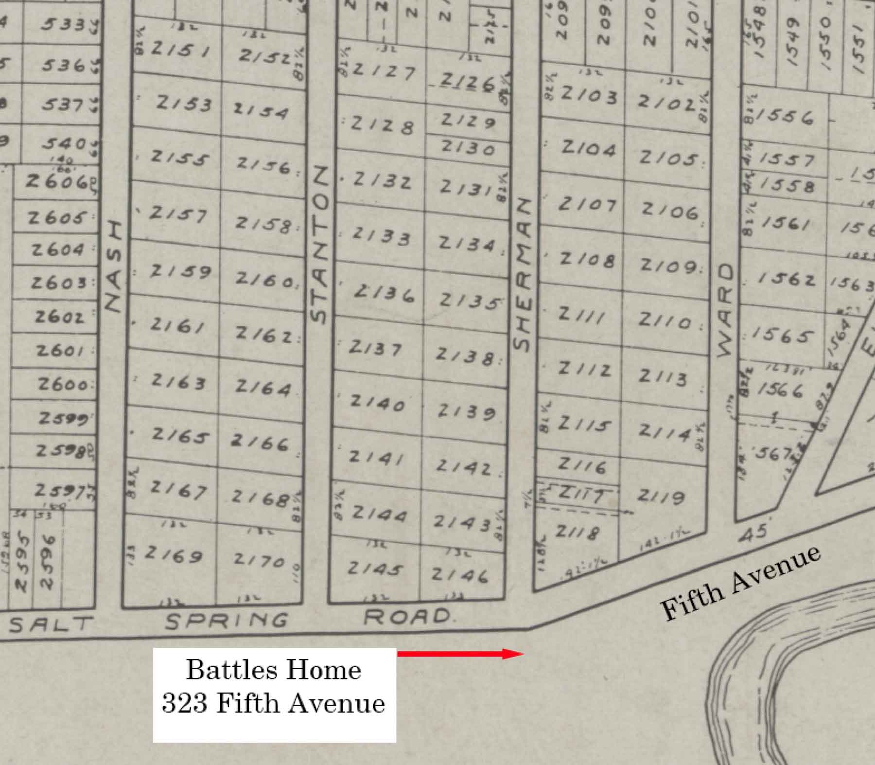 map showing the location of the John Battles home on Fifth Avenue. |