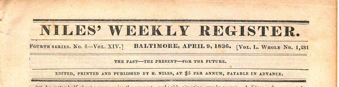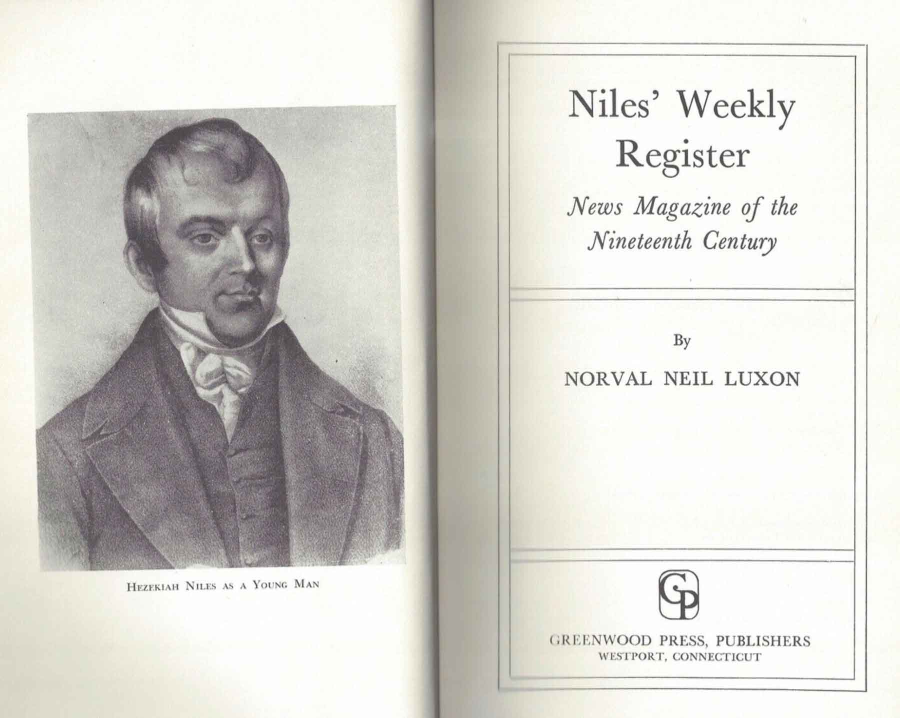 It was in 1811 that Niles as a newspaperman really comes into his own in Maryland, when he issued the prospectus for the Weekly Register and garnered a total of 1,500 subscribers even before the first issue hit the press. That first edition hit the streets of Baltimore on September 7, 1811. He would edit and publish the Weekly Register for 25 years, making it one of the most widely circulated magazines in the United States. His news magazine was on a scale of a more familiar LIFE in its day and Hezekiah became one of the most influential journalists of his time. Source: https://en.wikipedia.org/wiki/Hezekiah_Niles |