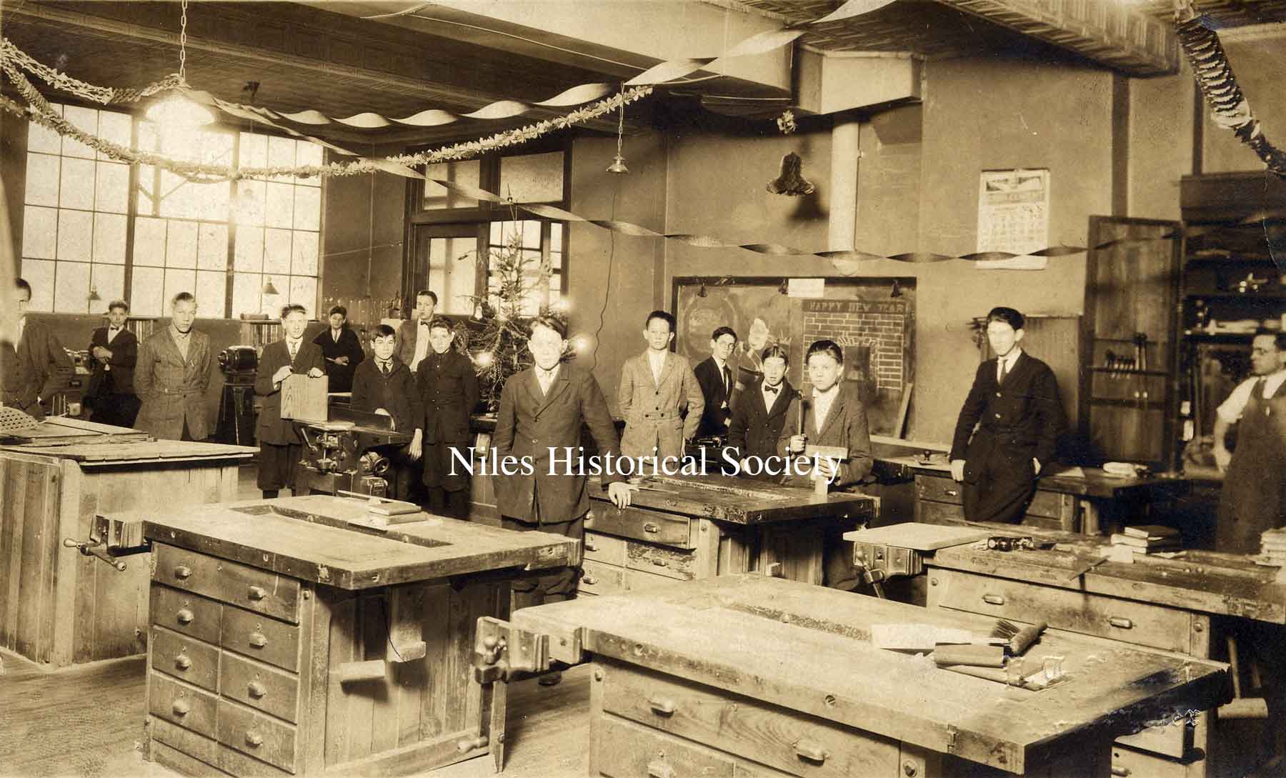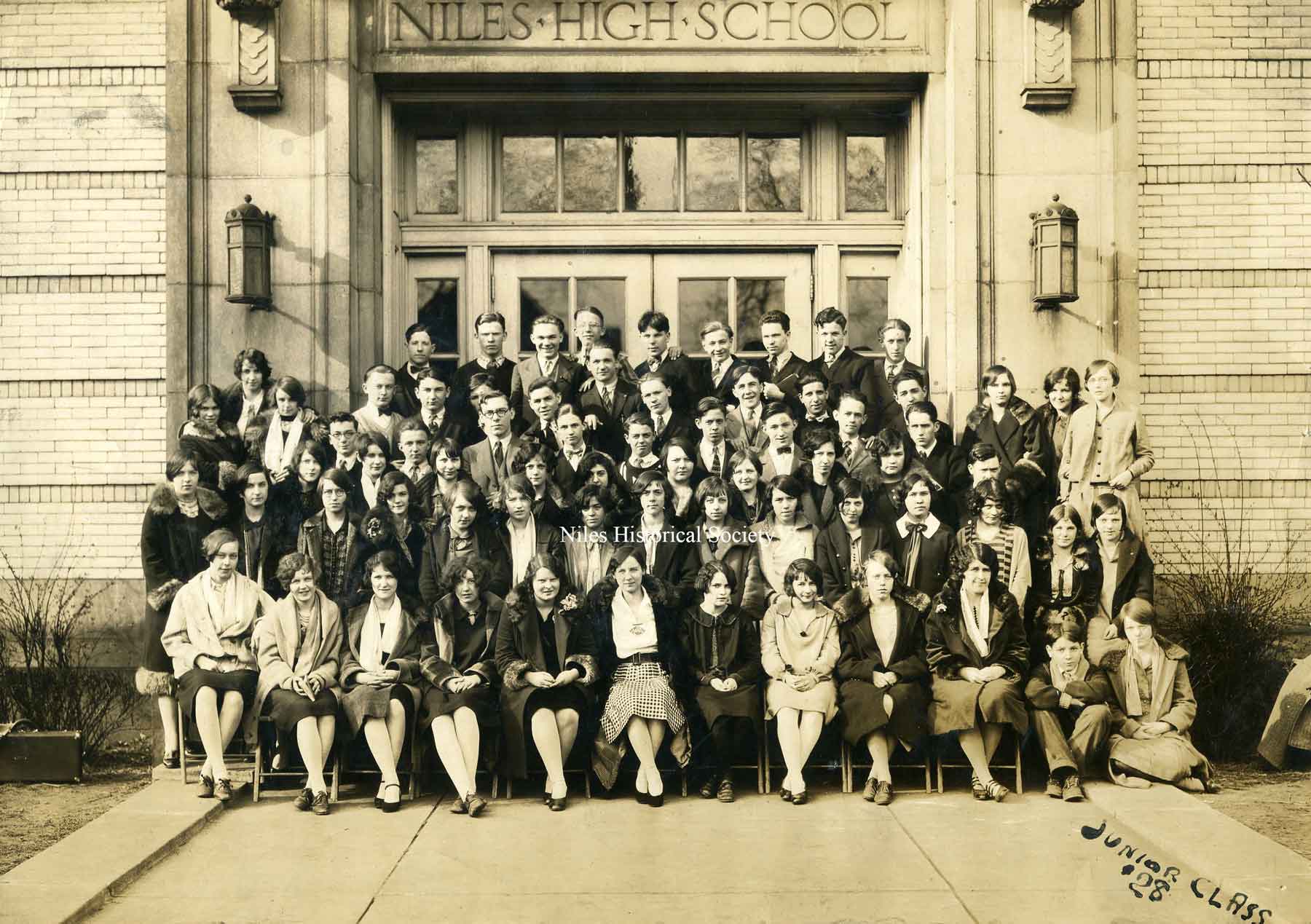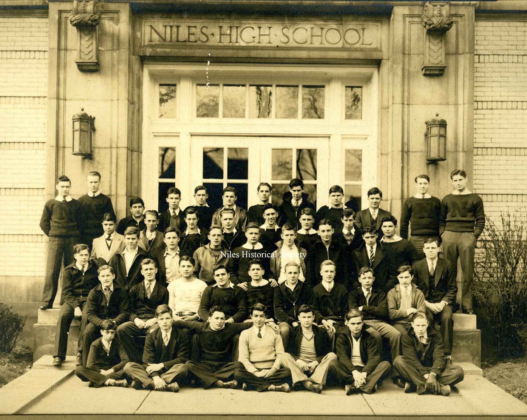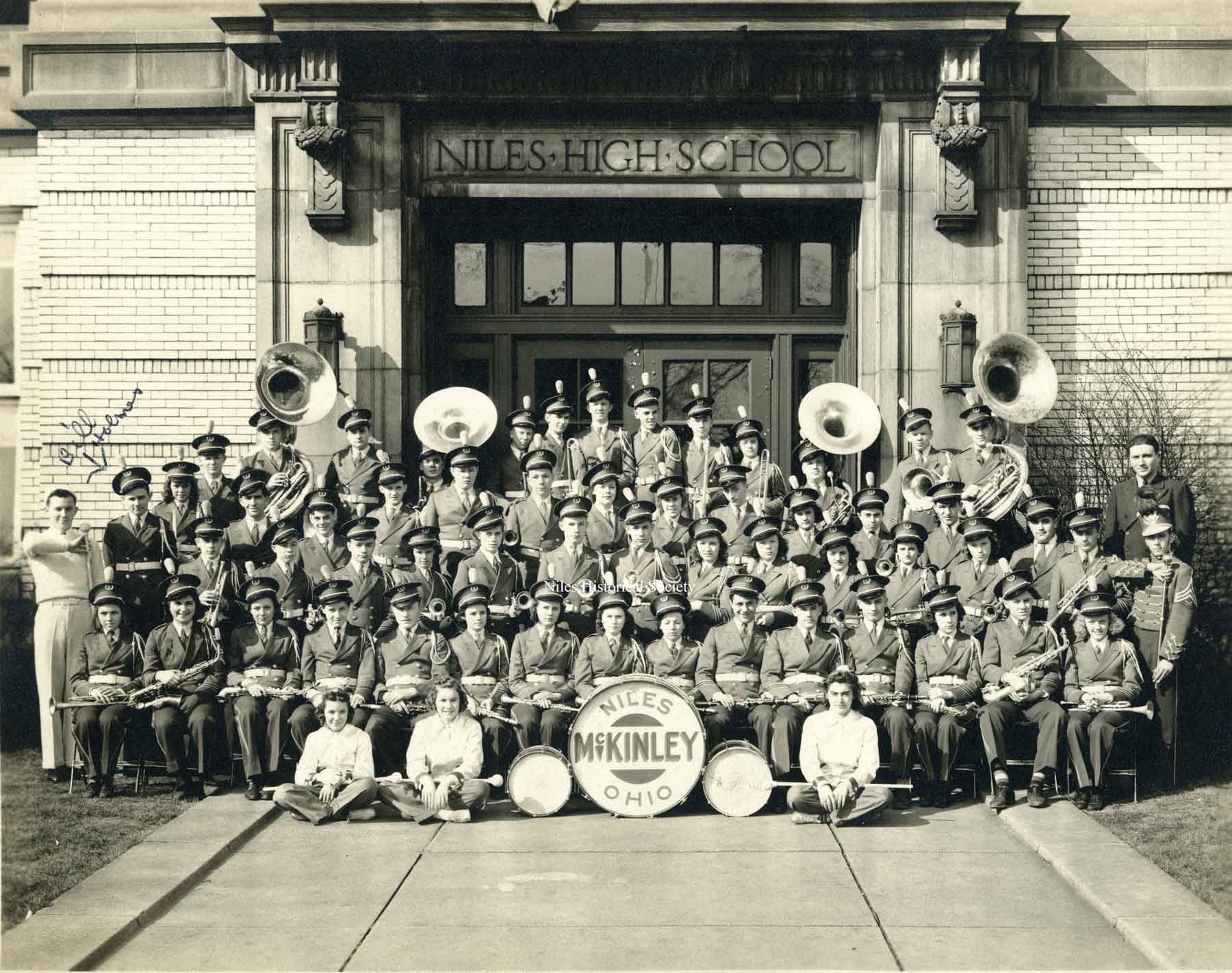 Niles School band 1941 all in uniform. Ruth Fisher, first front row; Mary Whitney, last front row. James Bill Holmes, marked on second row.