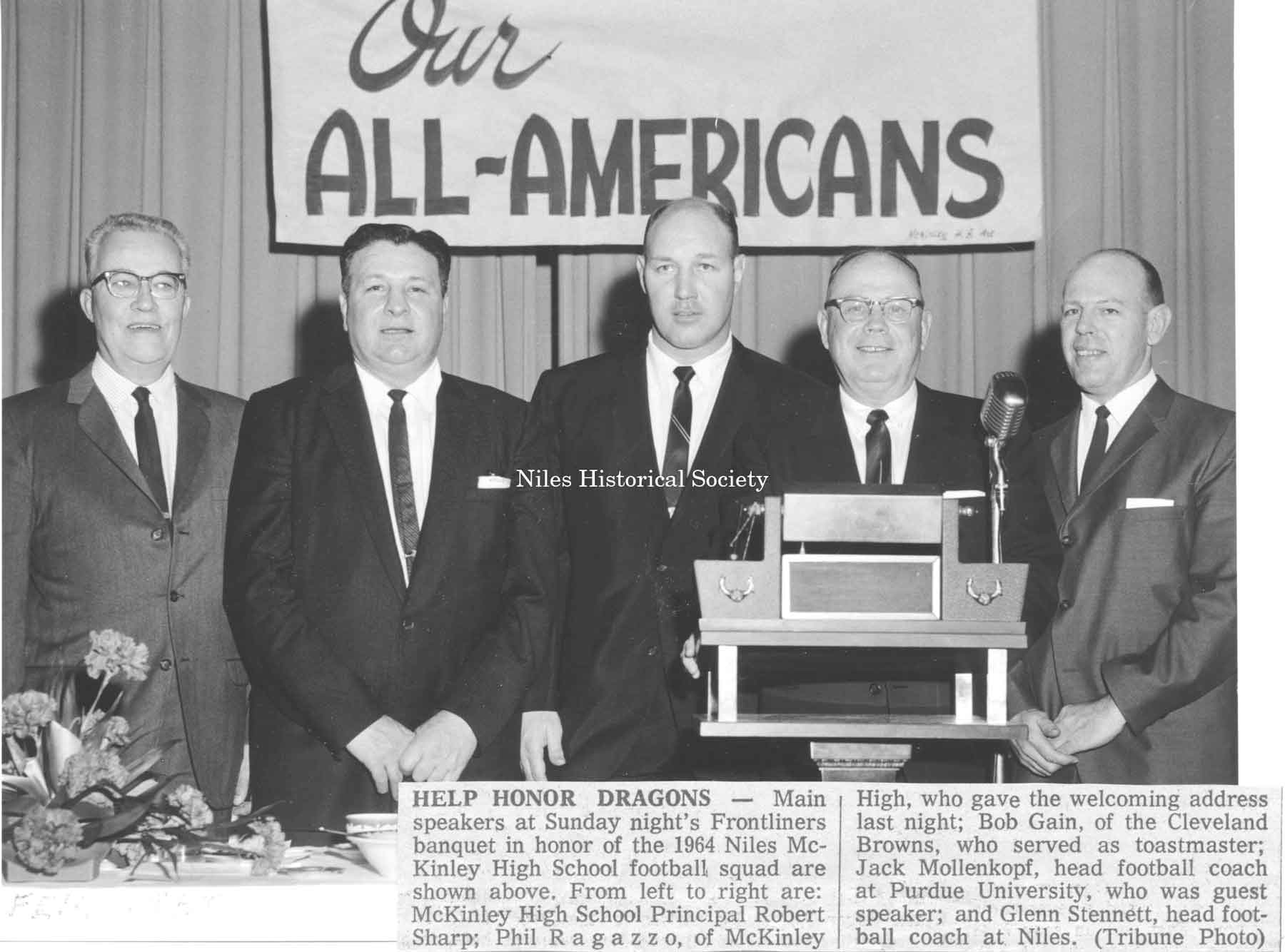 Speakers at Frontliners banquet in honor of the 1964 Niles McKinley High School football squad.