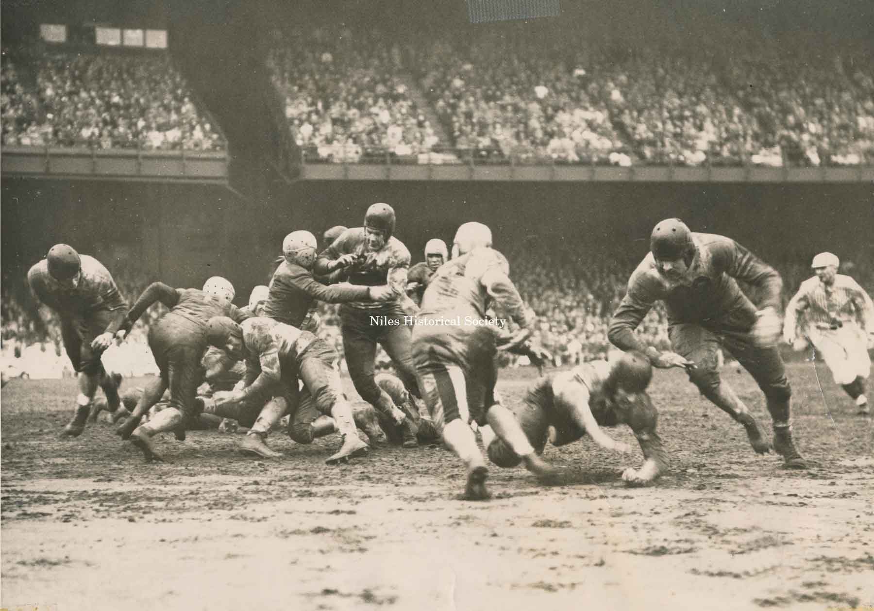 1936 photograph featuring Phil Ragazzo bearing down on running back.