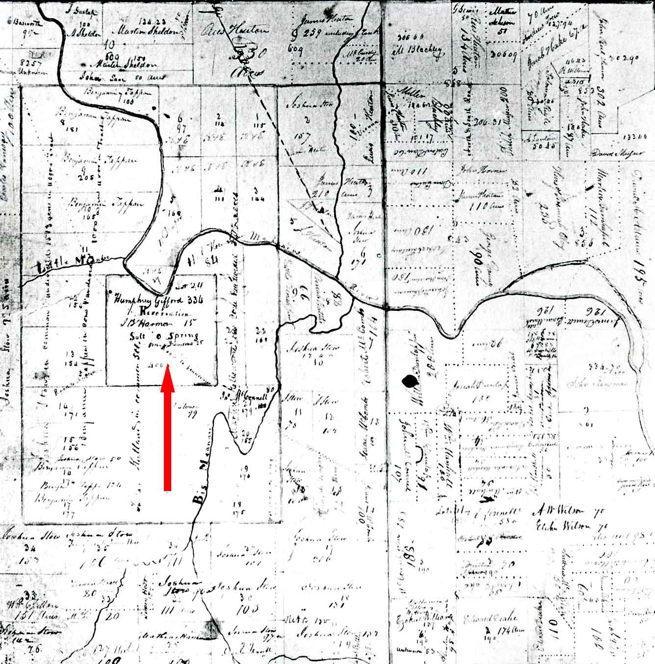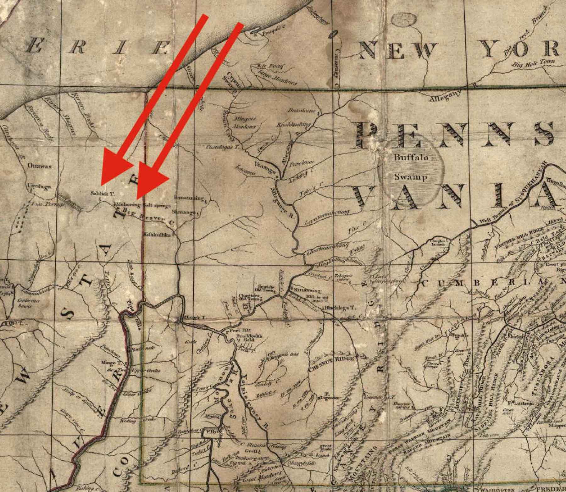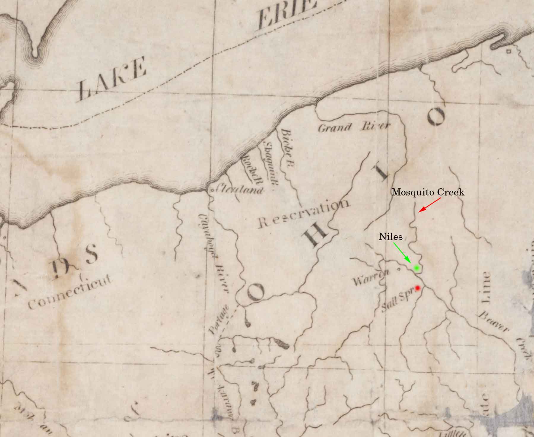 Early map of the Connecticut Western Reserve area marked with the location of the salt springs, Mosquito Creek and future site of Niles.