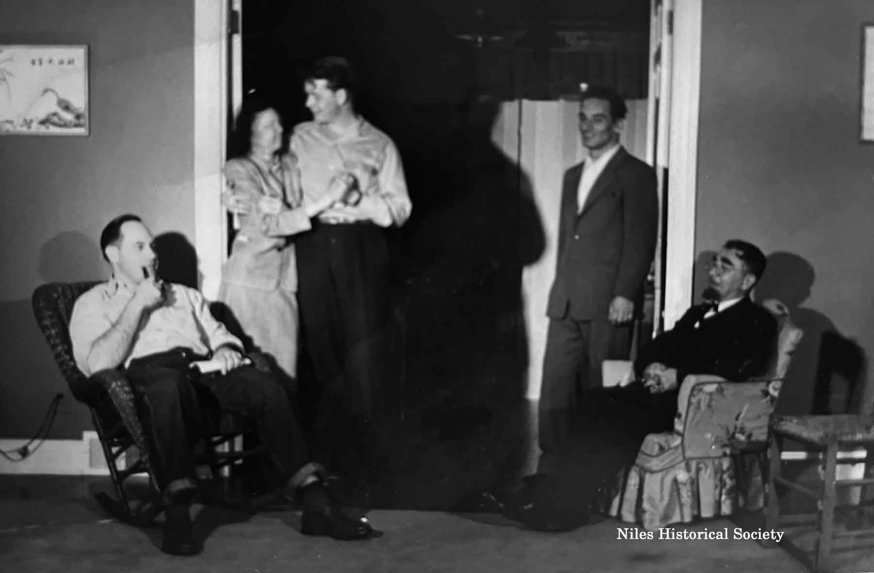 The first phase of the TNT Playhouse which cost $25,000 was completed in 1957. It included the stage, auditorium, and foyer. The mortgage was burned on this first step in June 1960. Pictured are: Richard Boyd, Marcia Russ, Carson, George Smith and TNT President, Stan Hollingsworth.