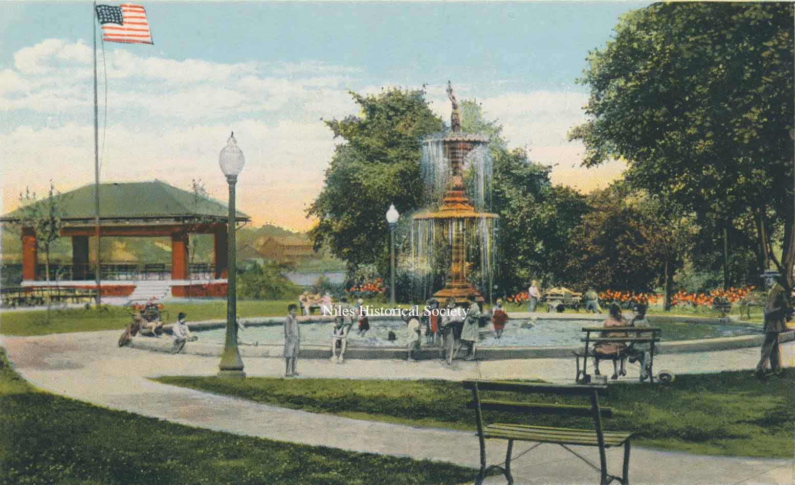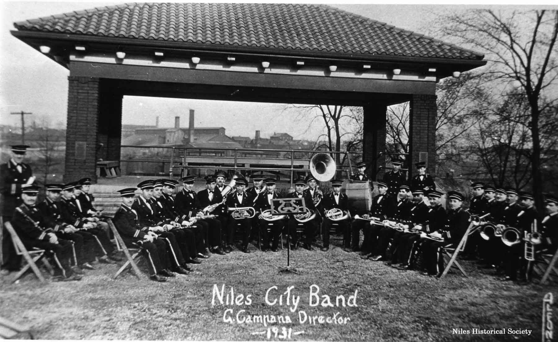 1931 picture of the Niles City Band in Central Park in the Thomas Pavilion. Band directed by Arnold Campana.