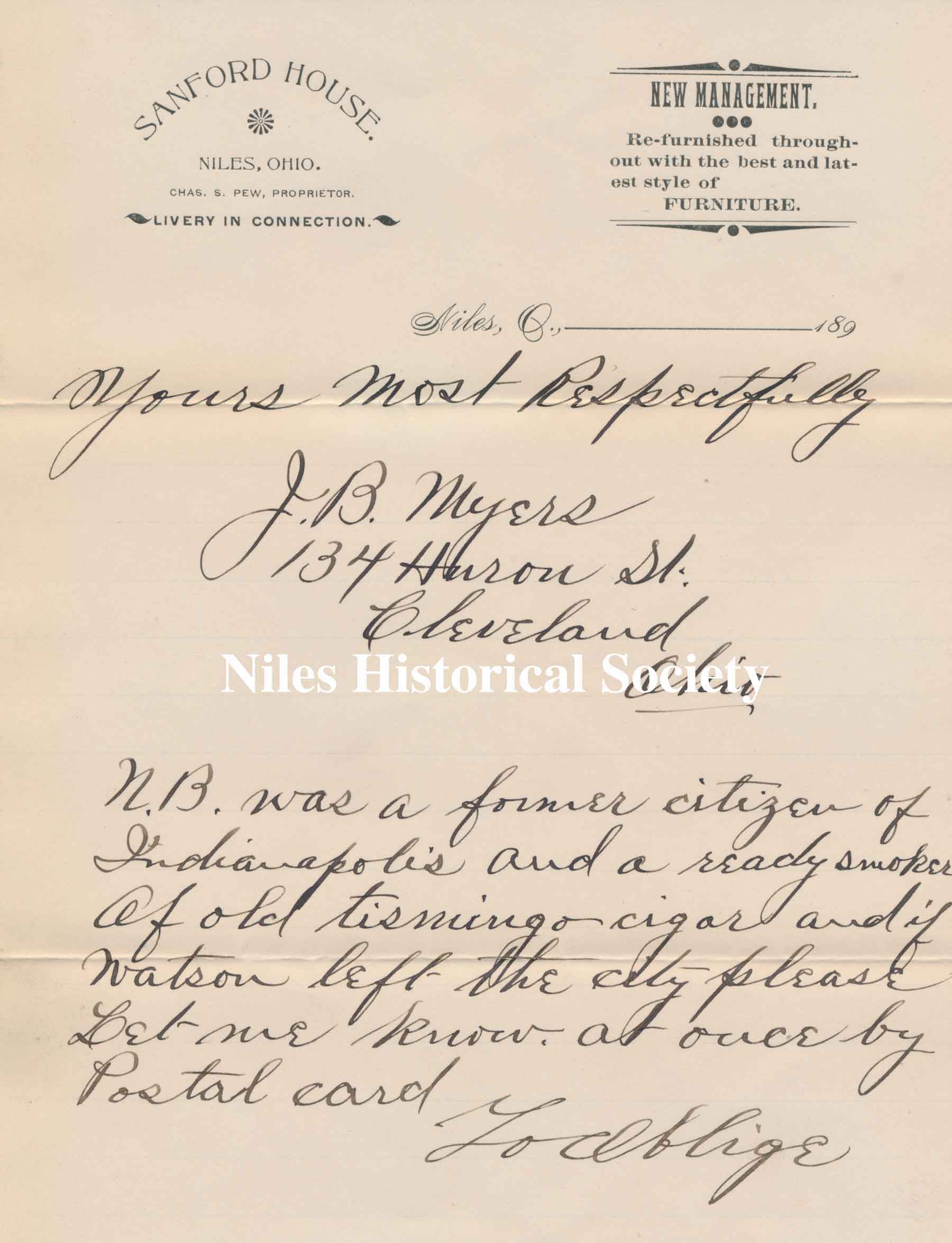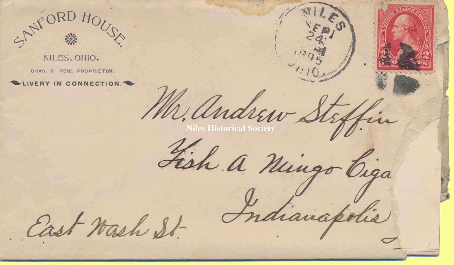 A letter mailed September 24, 1895 with the letterhead of the Sandford House.