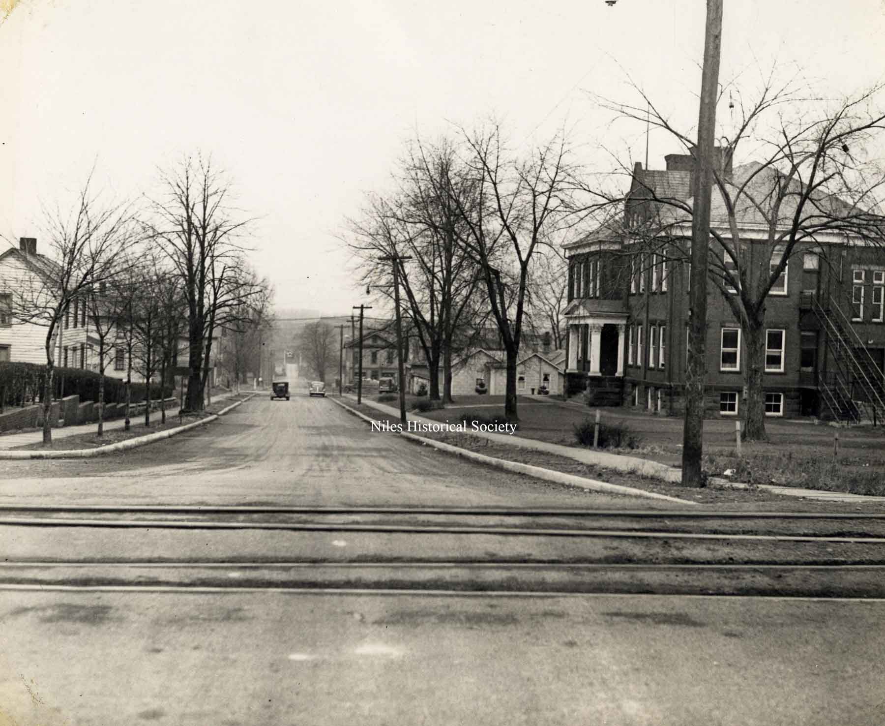 Belmont Avenue looking south from the railroad crossing. The bridge across the Mahoning river is in the distance and Bert Street School is on the right.