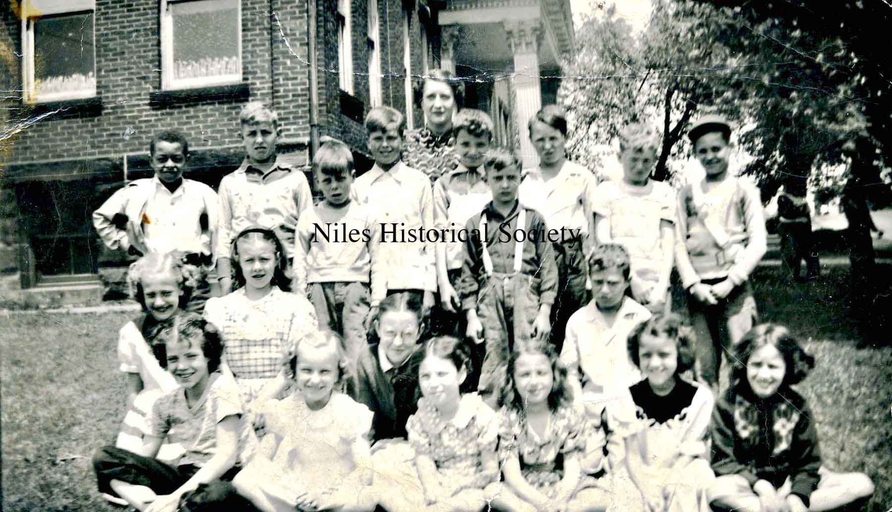 Group of children and teacher posing for a photograph near the front of Monroe School.