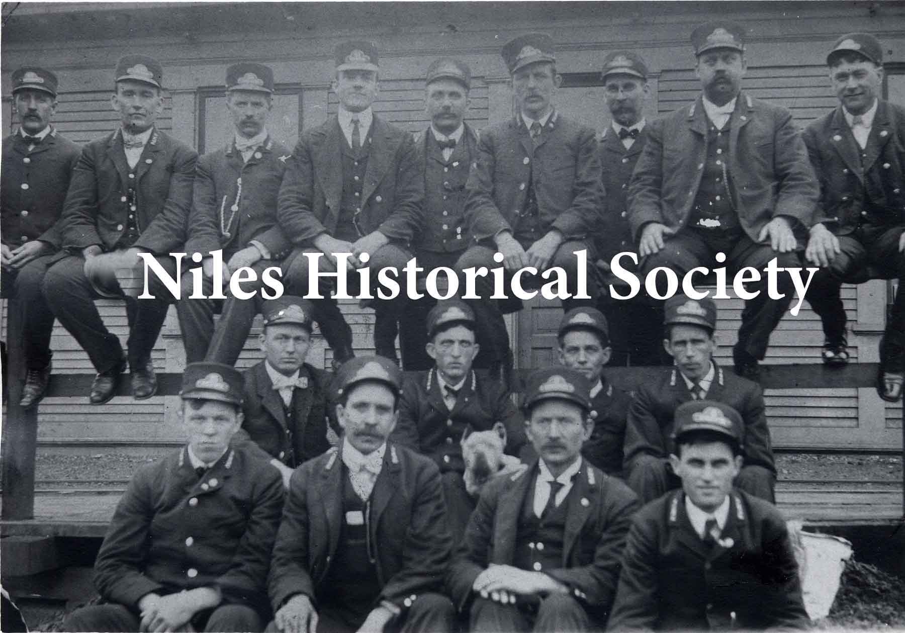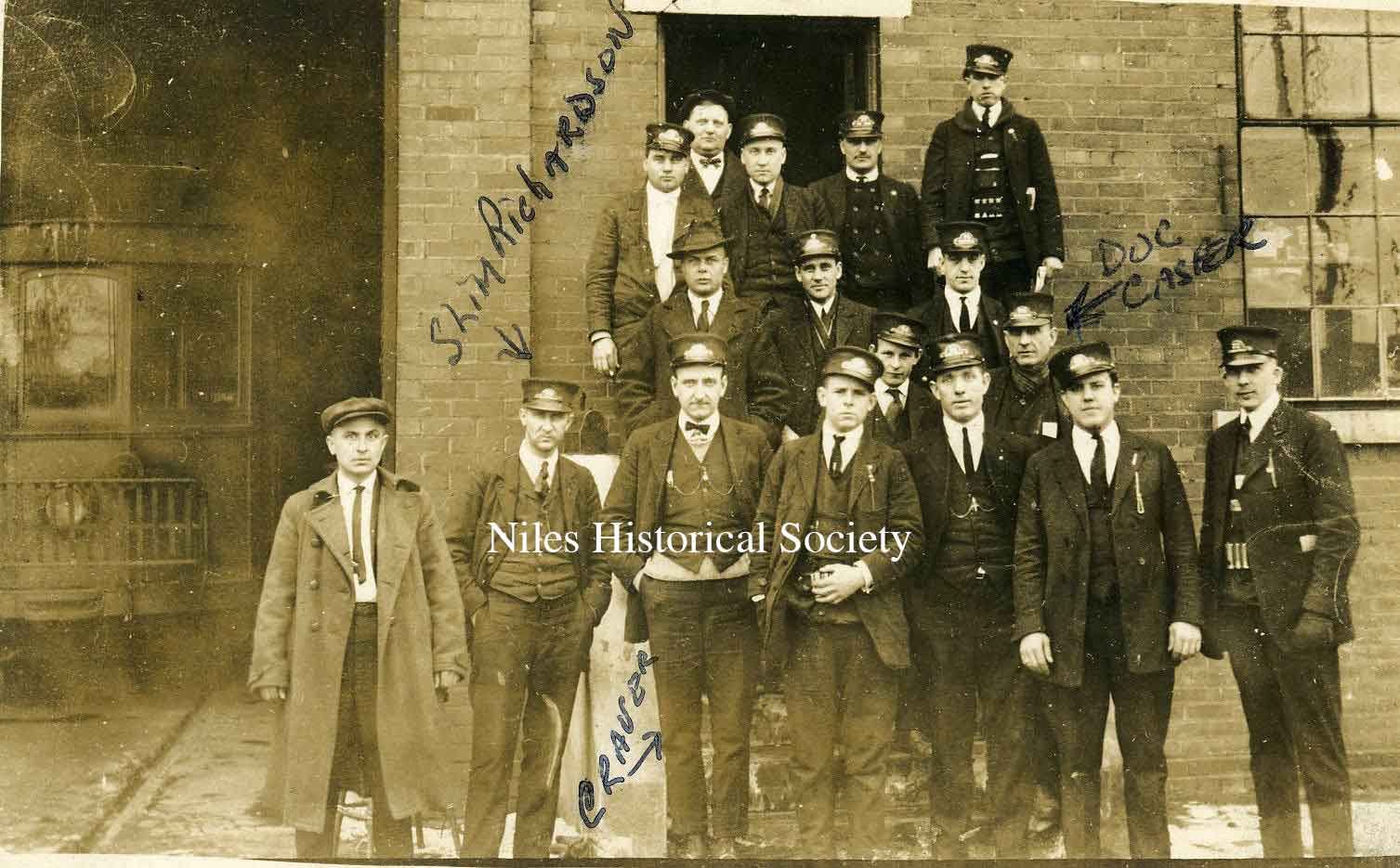 Streetcar motormen from the Mahoning Valley Electric Railway Company of Niles. In the back row, second from the left is Roy Swegans and the third from the right is John Curry.