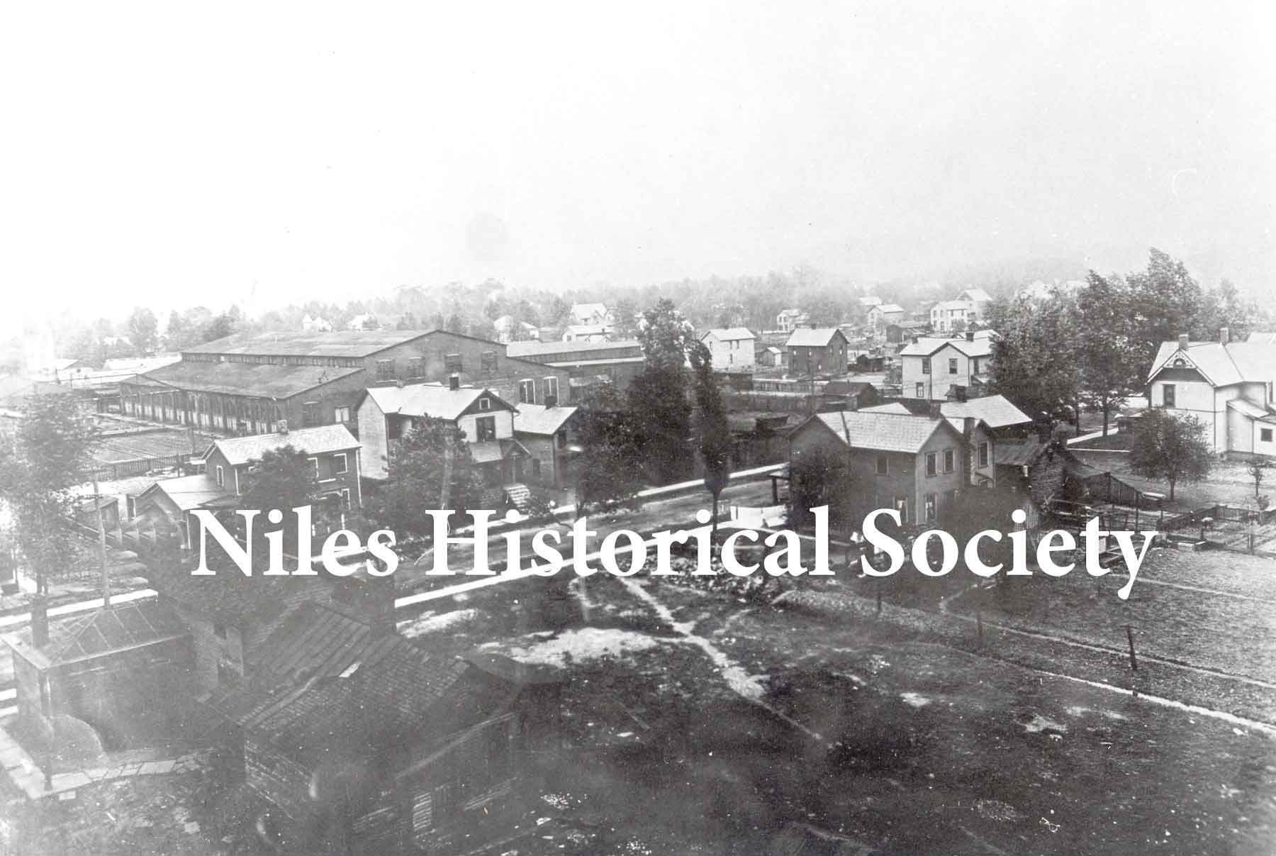 Photo of one building of the Niles Car & Manufacturing Co. taken from atop the water tower in the early 1900's.