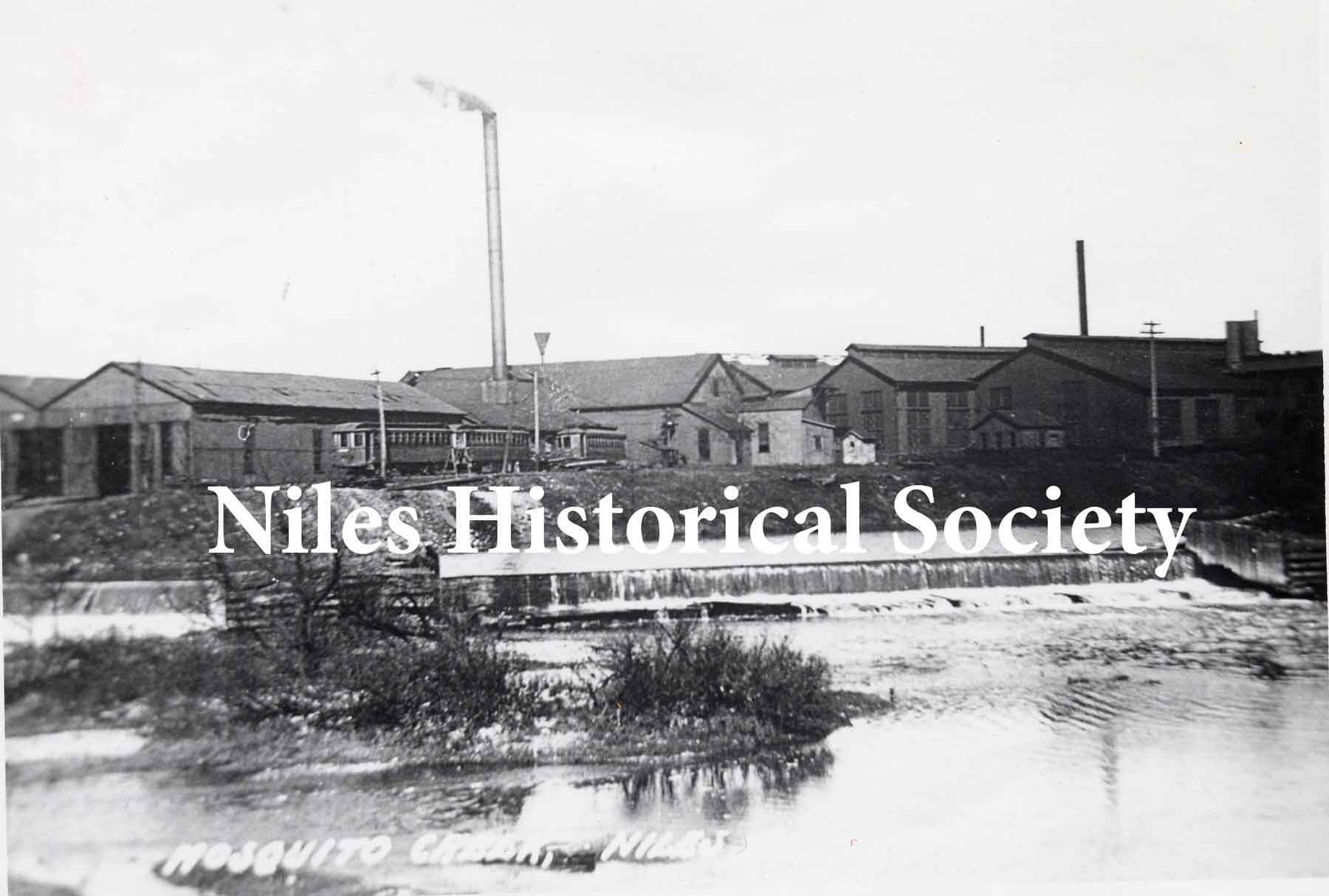 The car barns were located on the west side of Mosquito Creek just above the dam. The entrance to the barns was off Robbins Avenue.