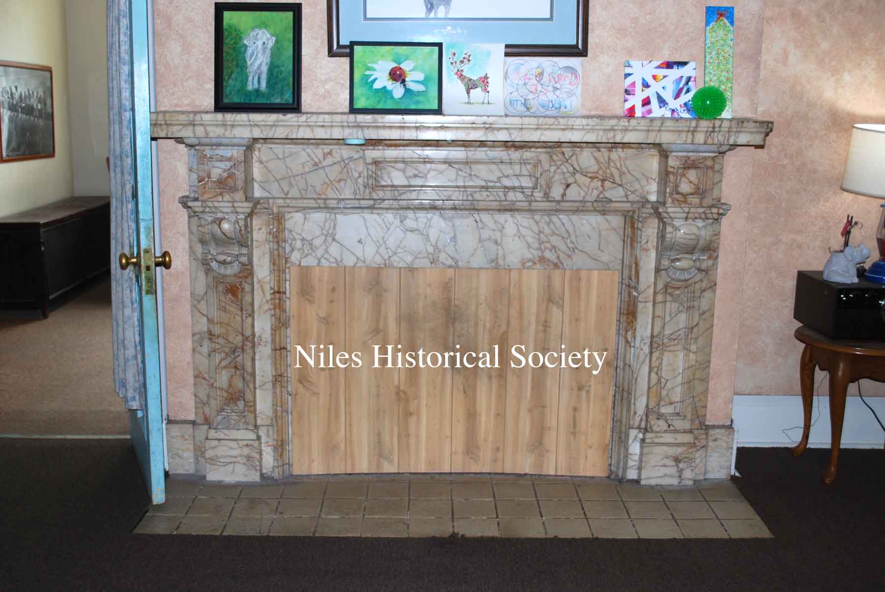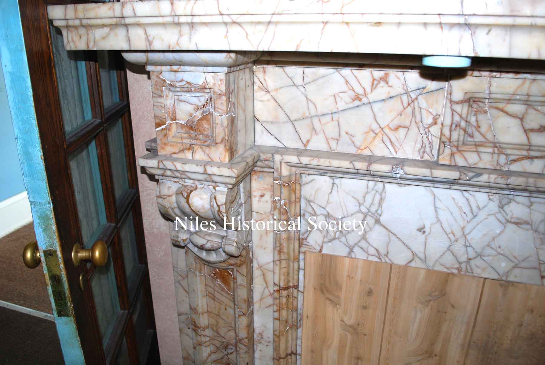 Close-up of marble fireplace.