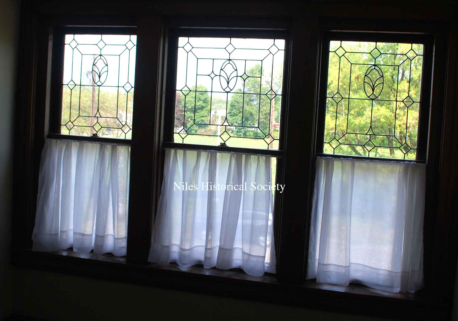 Cut glass windows at the top of the first floor stairway landing.