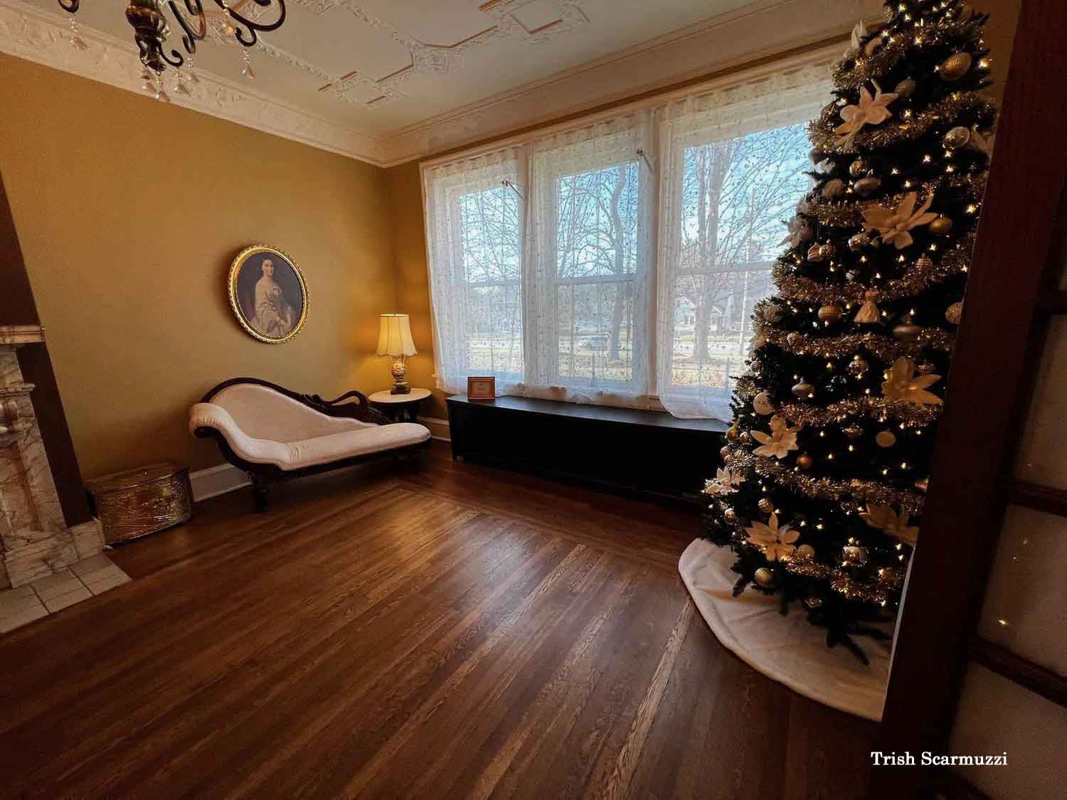 Pictured above is the formal dining room with marble fireplace mantel.
