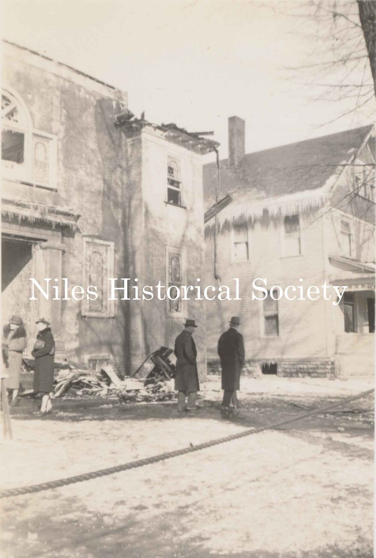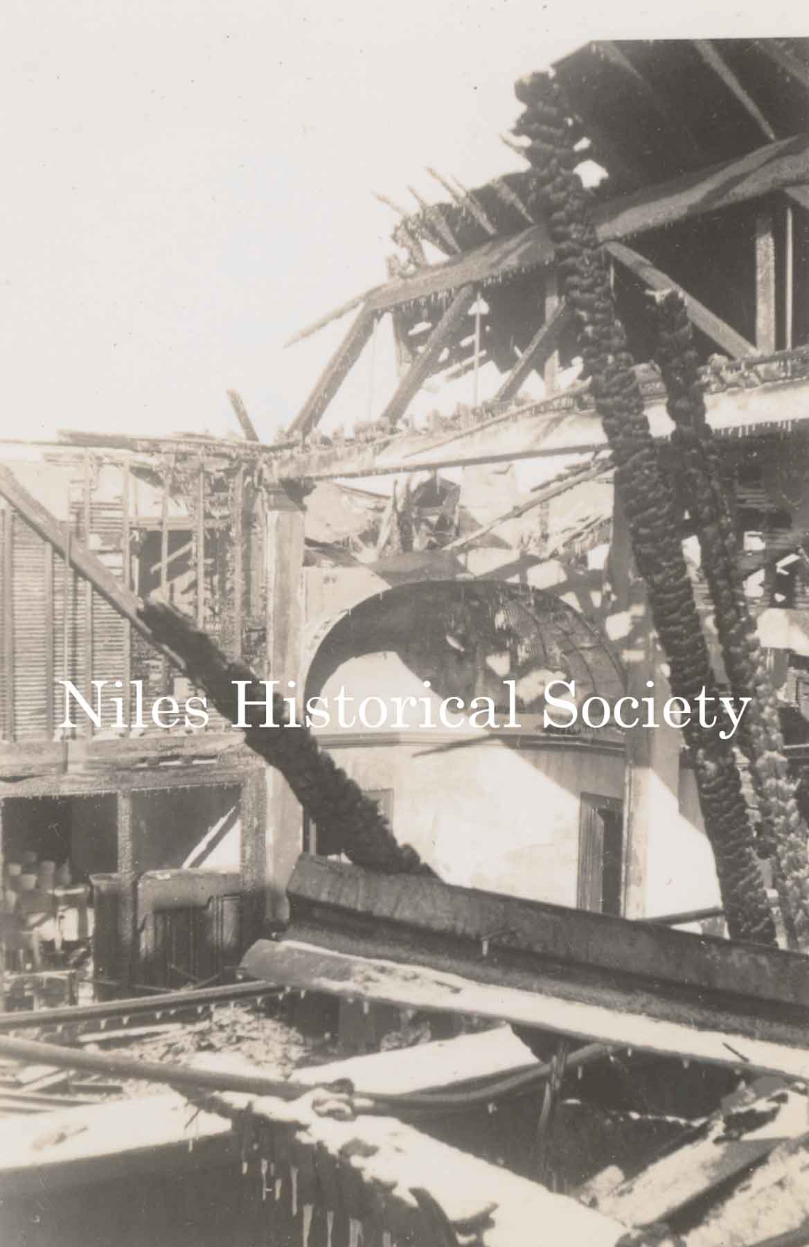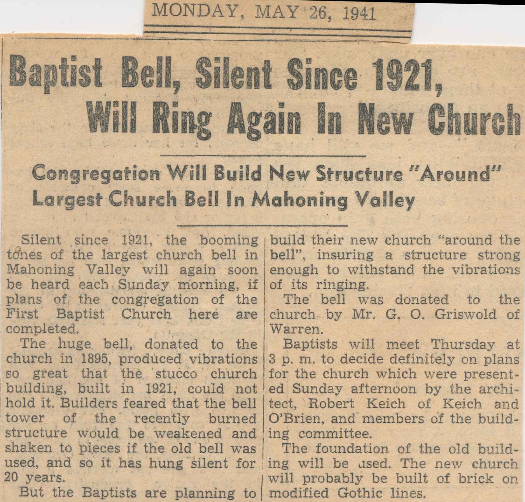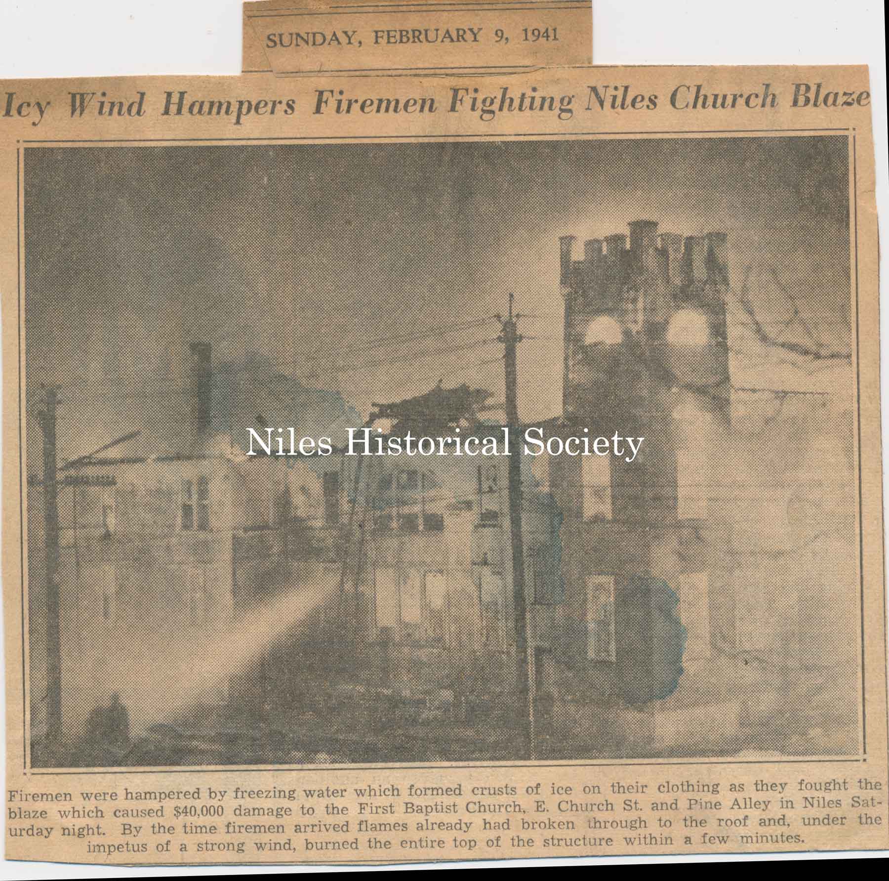 Newspaper clipping with details of the fire that destroyed the First Baptist Church built in 1920.