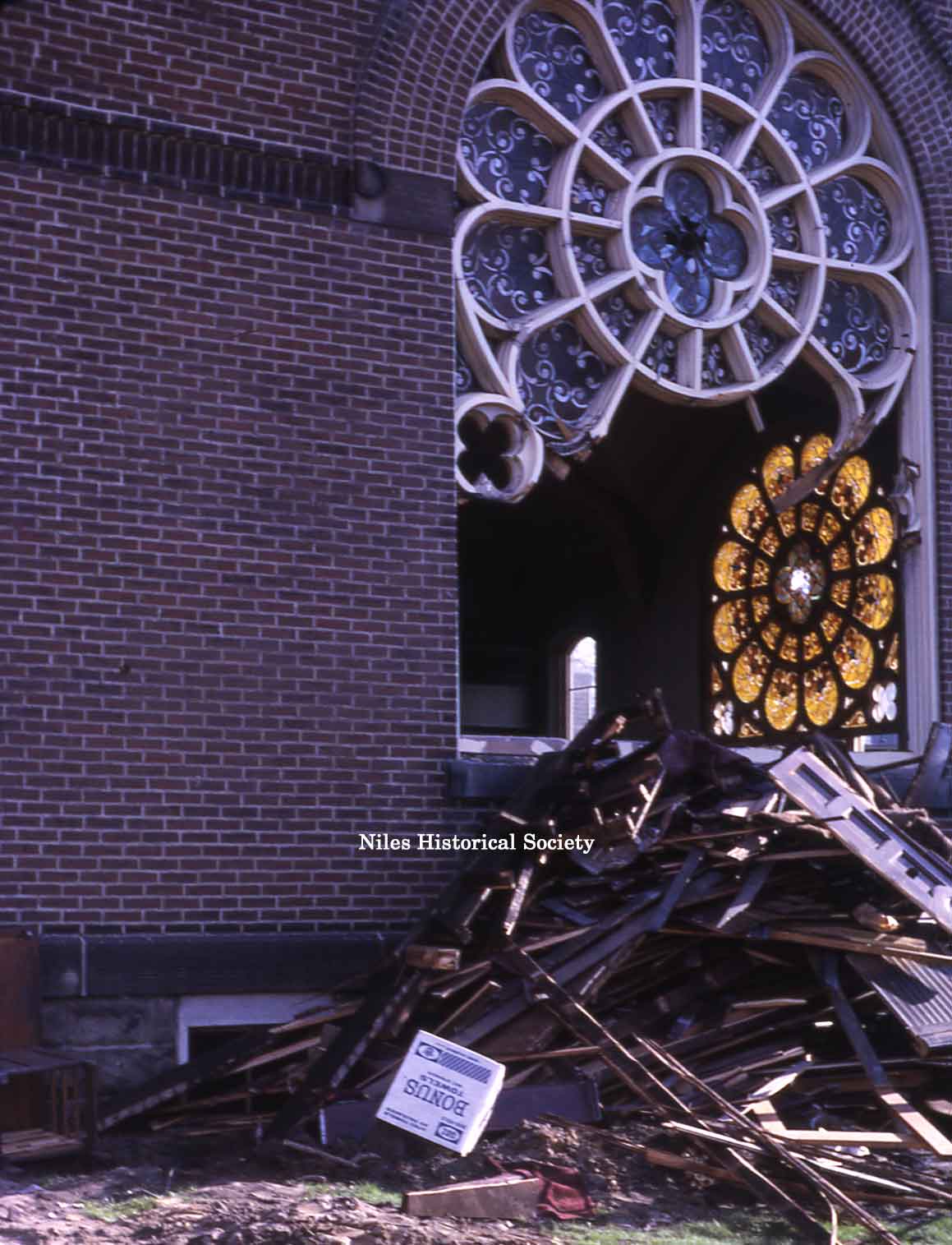 Exterior view of the stained glass window during the demolition of the church in 1966.
