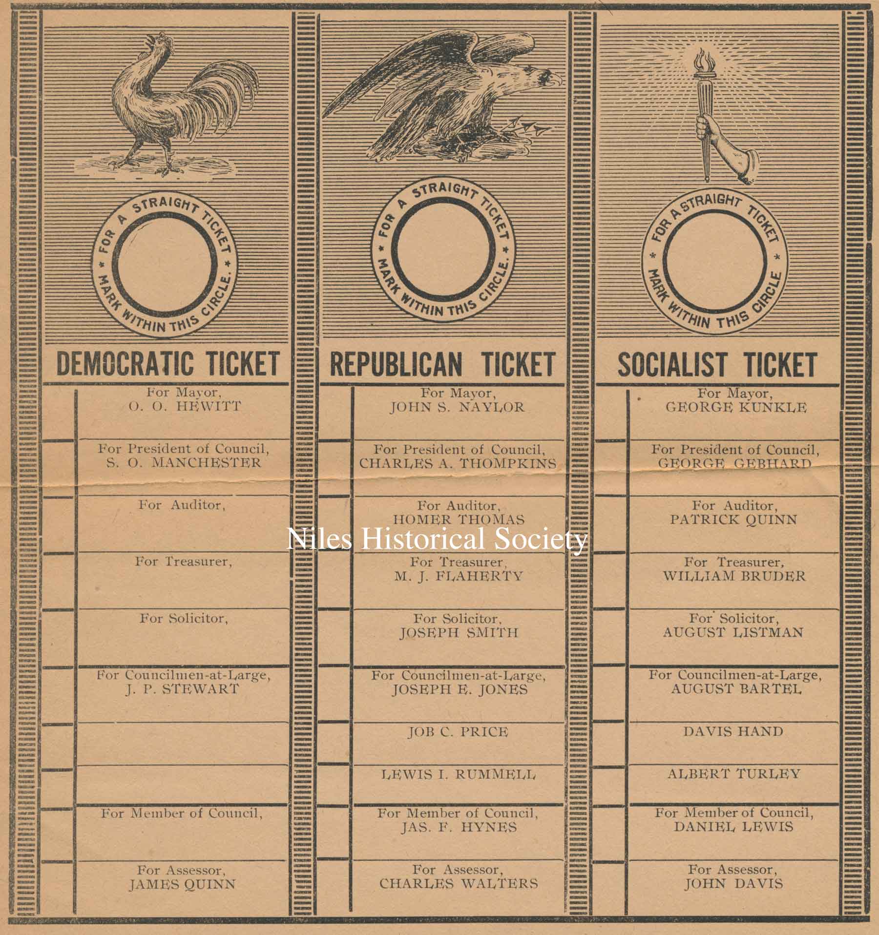 1909 city voting ballot for the Democrat, Republican and Socialist candidates and their respective offices.