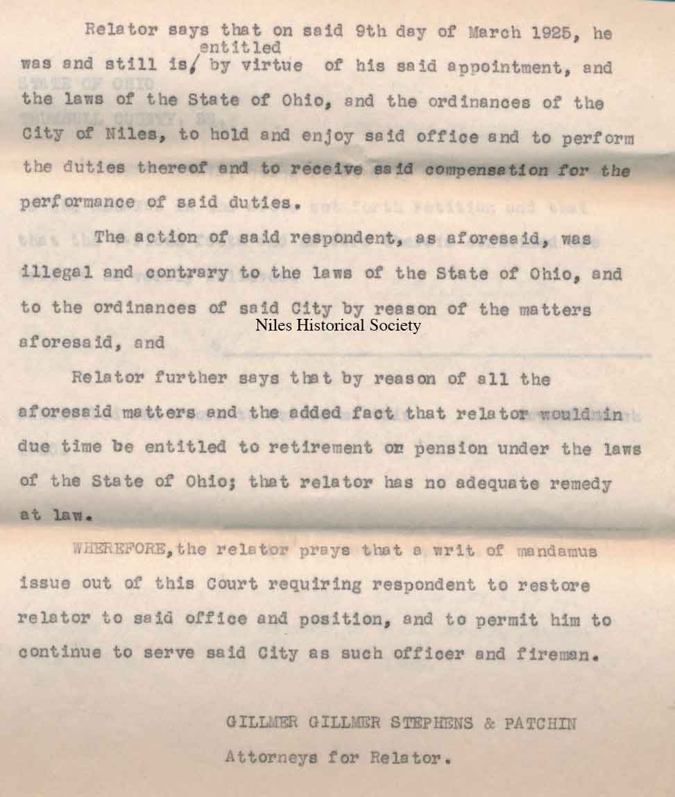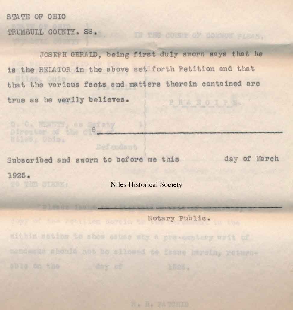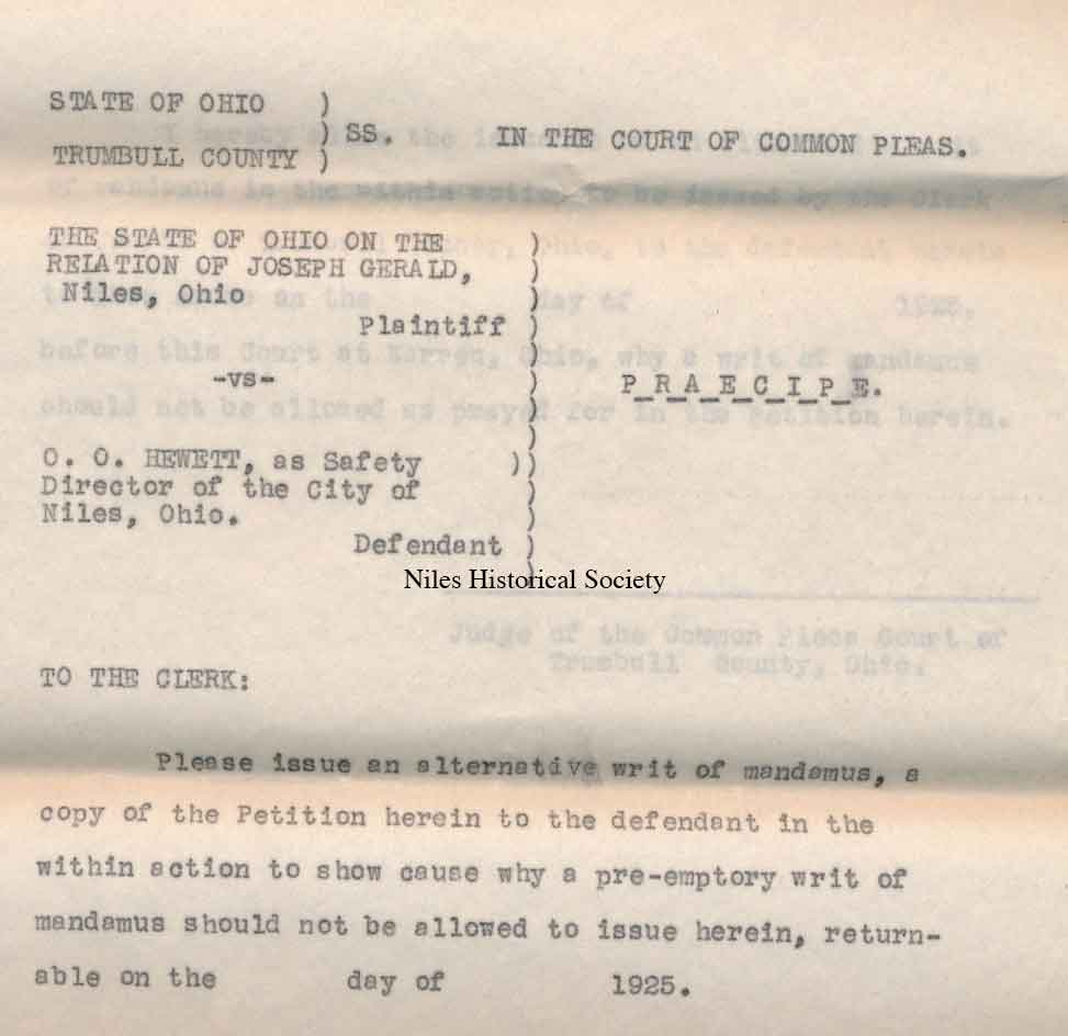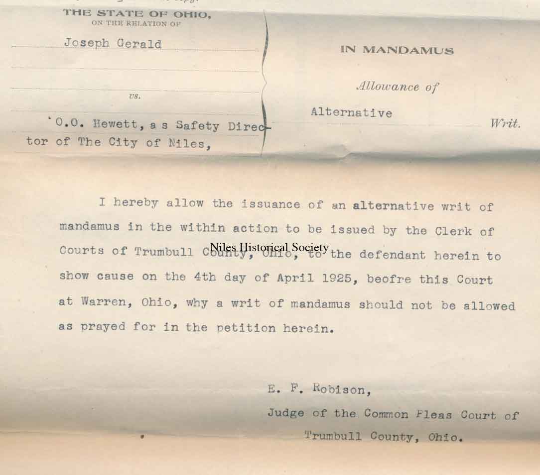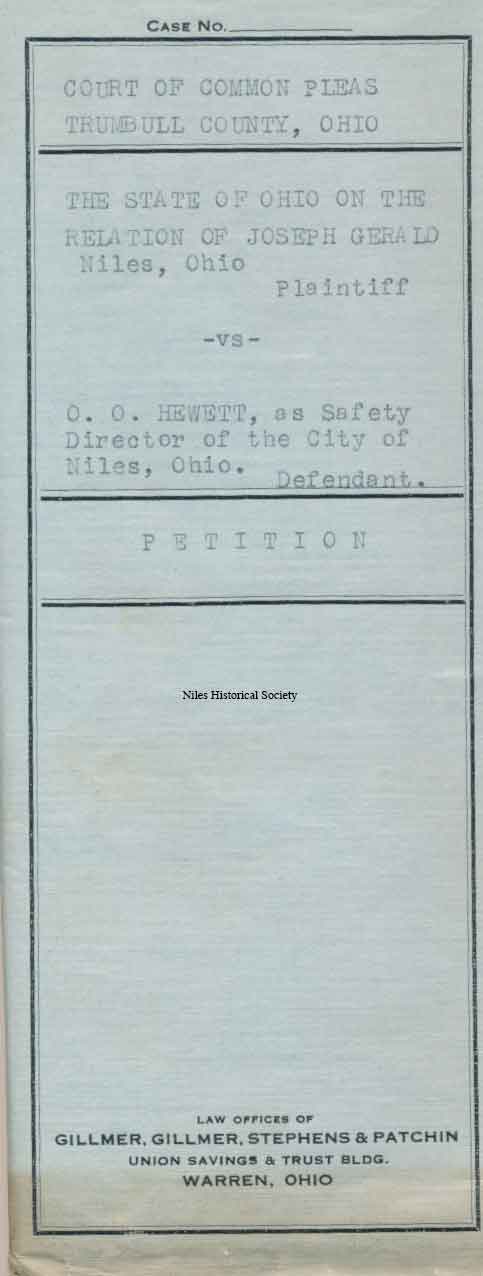 1925 lawsuit by police officer Joseph Gerard against City of Niles and Safety Director, O.O. Hewitt.