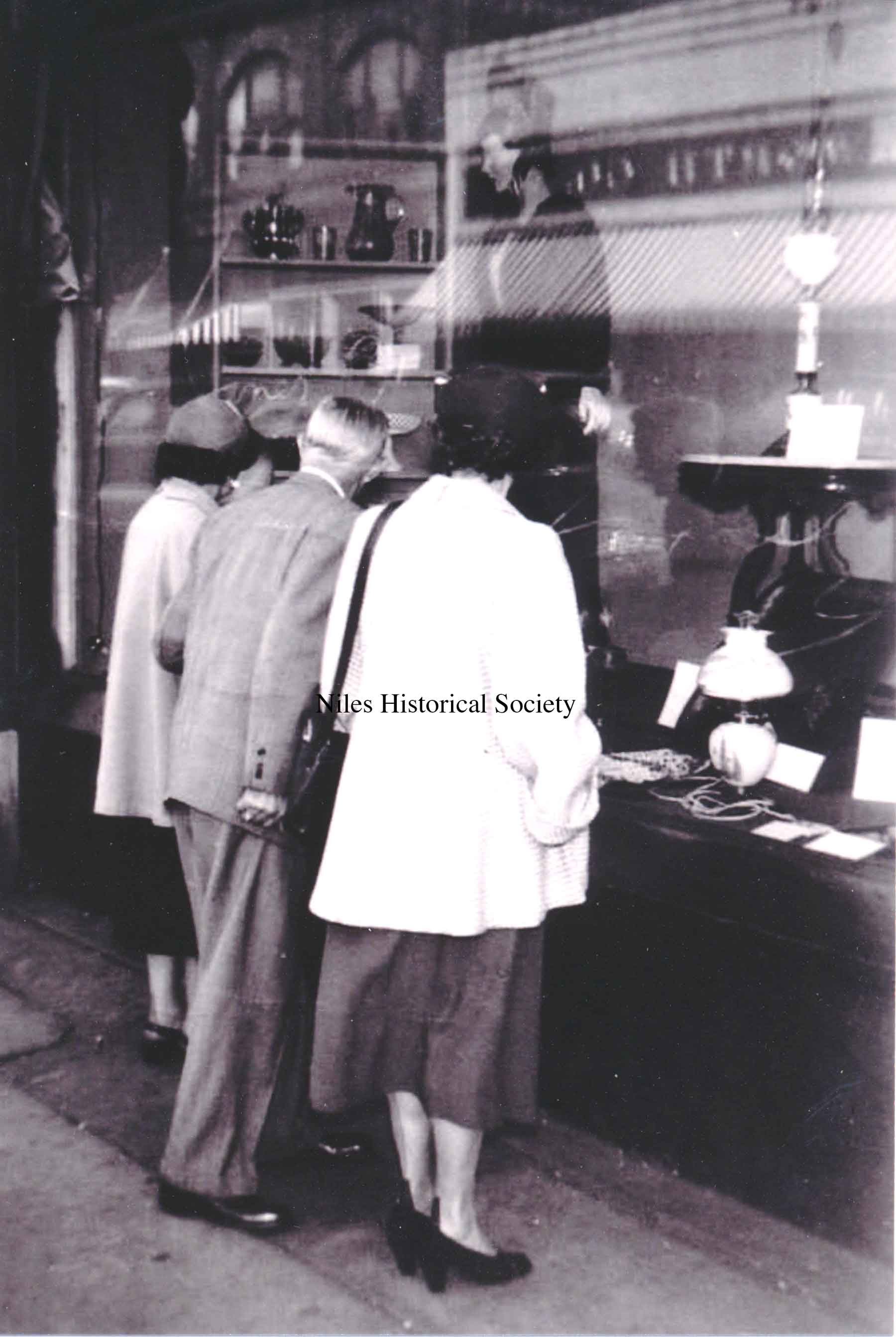 Homer Hoffman looking at antiques in display window.