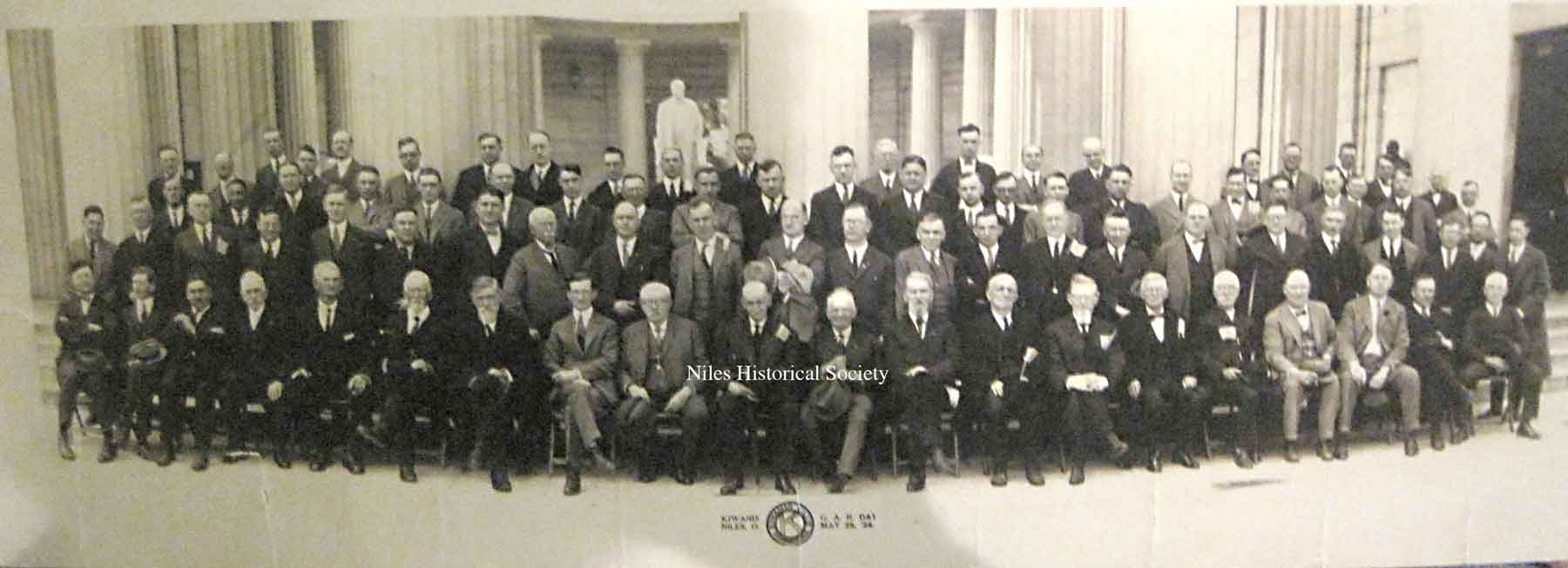 A formal portrait of the members of the Niles Kiwanis Club posed in front of the McKinley Memorial on Grand Army of the Republic Day, May 28, 1924.