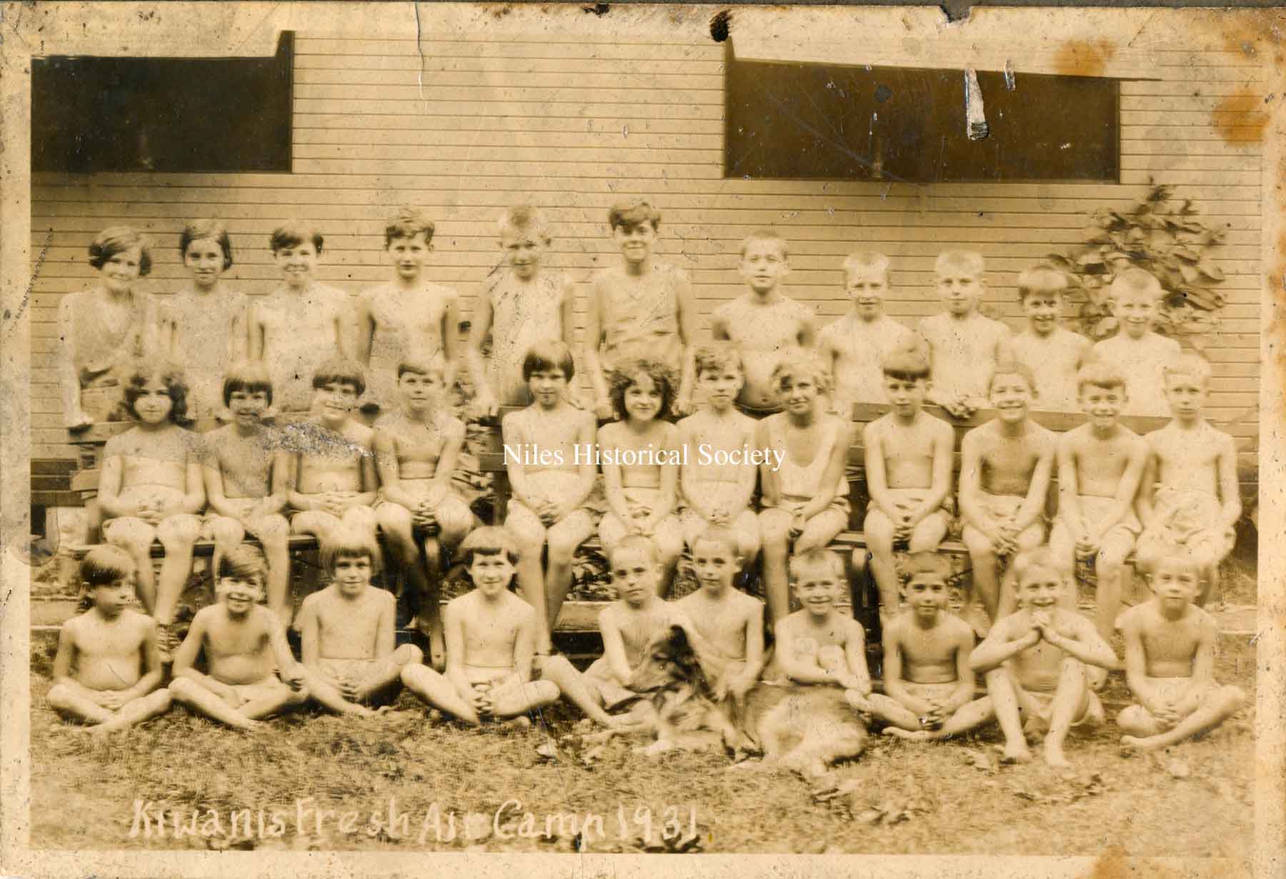 Fresh Air Camp (1931) with boys and girls in front of shower and camp kitchen building.