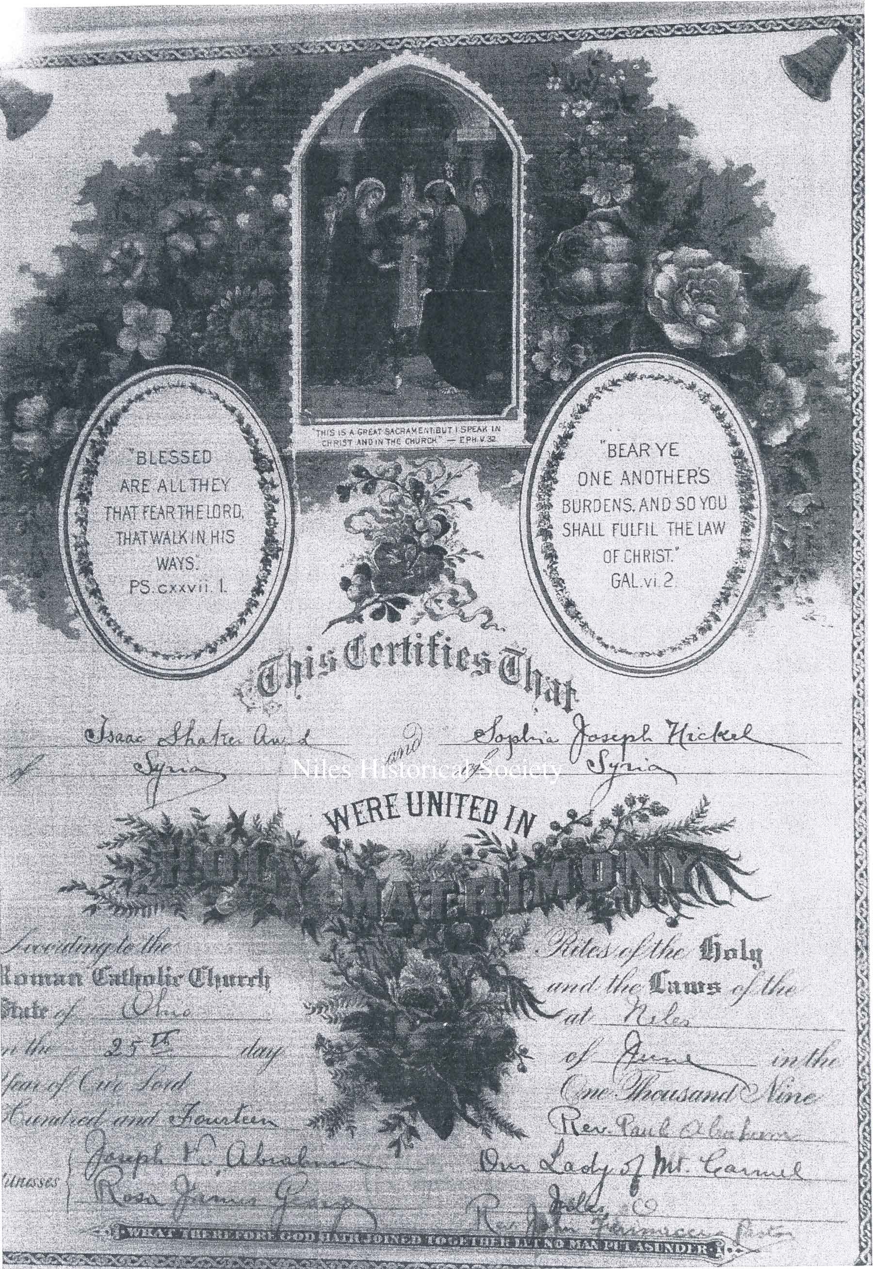 Wedding certificate of Isaac and Josephine Shaker, married on June 25, 1914.