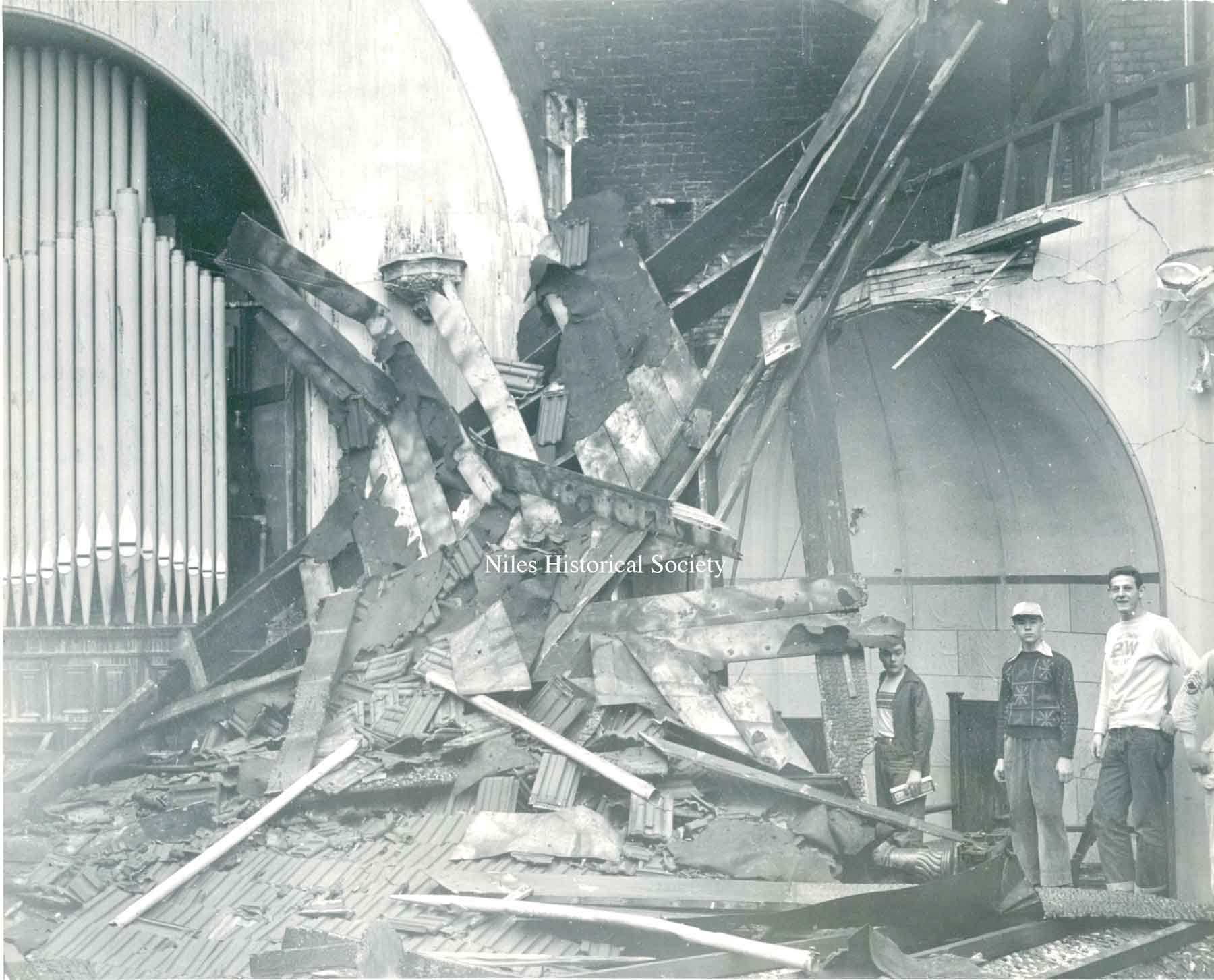 February 1953: Strong winds blew down temporary scaffold around the First Methodist Church. Burned October 1, 1951, the building is being wrecked this week.